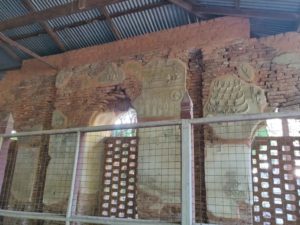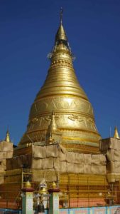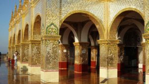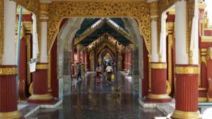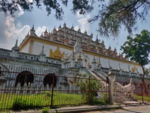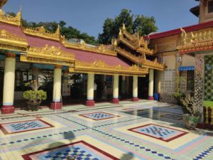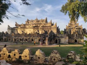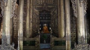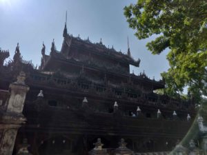 On visite quatre temples : d’abord la belle pagode en teck Golden Palace Monastery, où on paye la « taxe archéologique de Mandalay » de 10 000 kyaths (valables pour plusieurs sites de Mandalay), et où on voit des artisans en pleins travaux de restauration derrière.