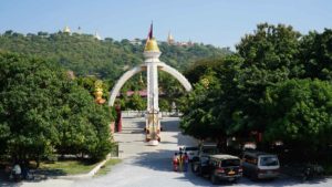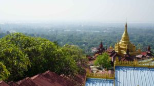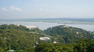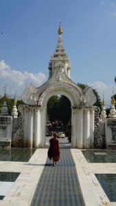 Ensuite, direction Sagaing Hill, plus loin. On traverse un très grand pont avec la vue sur Sagaing, qui a plusieurs petites collines très mimi avec à leur sommet une ou deux pagodes et leurs pointes dorées, c’est beau ! Dans le tuktuk, on discute et on rigole bien avec Nyi Nyi, et Juan nous fait partager son vocabulaire birman : « Mingalabar » pour dire bonjour, « Yisuba » pour dire merci, « Tata » pour dire au revoir . Ça fait plaisir de pouvoir interagir un tout petit peu dans la langue du coin ! On monte les marches de Sagaing Hill, ça ressemble pas mal à Mandalay Hill (il fait plus chaud) mais ça nous va très bien. Arrivés en haut, on se balade dans la pagode, on profite de la vue, puis on redescend. En passant, on fait la connaissance d’un moine avec qui on discute et qui est fan des « French classics songs ». Il me demande de lui chanter « La vie en rose », ça fait un joli décalage avec le paysage des pagodes birmanes… 😉