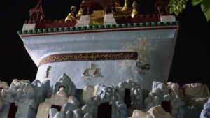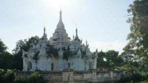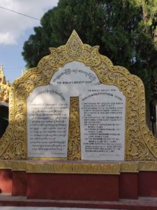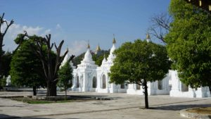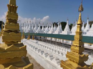 Après manger, direction le Kuthodaw, et là bingo, on est de nouveau presque tout seuls à part les locaux venus prier. On profite de la balade au milieu des innombrables petites pagodes blanches, chacune abritant une stèle gravée en birman. On croit que c’est des tombes, mais il s’agit en fait du plus grand livre du monde : 729 pierres gravées du Tipitaka, les principes du bouddhisme. Trop classe !