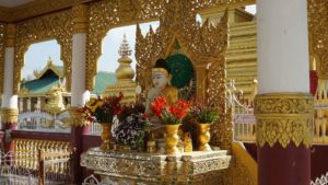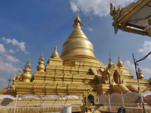 Puis on rejoint Nyi Nyi qui nous emmène à la Buddha University où, si j’ai bien compris, les gens viennent prendre des cours sur le bouddhisme et/ou passer leurs examens écrits de moines. Autour de l’immense coupole dorée, une myriades de bouddhas, venant de presque tous les pays d’Asie ! Ça nous fait une belle petite mosaïque de photos 🙂