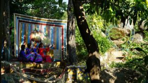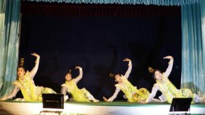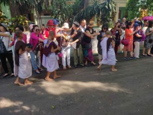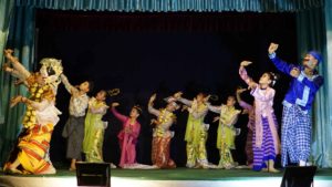 Pupun (je ne sais pas si ça s’écrit comme ça) une des aînées de 17 ans, discute bien avec moi, et m’invite à manger avec eux le midi au bâtiment qui leur sert aussi de dortoir. Les quatorze élèves de l’école viennent tous de la campagne de la région, et sont recrutés suite à des auditions quand la troupe donne des représentations hors de Mandalay pendant les deux mois d’été. Ils sont logés (en dortoir donc) et nourris à deux minutes à pied du théâtre, et alternent entre une demi-journée de cours « classiques » à l’école du quartier et une demi-journée de cours au théâtre : danse, musique (chant, petites percussions et instruments d’accompagnement dont xylophone et piano) et jeu d’acteur. Ils ont plus d’une centaine de morceaux, chants et danses traditionnels à connaître pour pouvoir plus tard devenir artistes professionnels et/ou professeurs. Le repas est très bon même si je fais bien attention à ce que je mange (« Spicy ? No spicy? Really really no spicy? »), et je rencontre la directrice de l’association qui me raconte comment la structure fonctionne. Je leur montre une Circle Song avec les percussions corporelles, c’est un peu trop compliqué mais on s’amuse bien ! Puis la professeure de chant, plus âgée, qui ne parle pas un mot d’anglais mais qui fait des bonnes blagues et avec qui on parle avec les mains, me fait chanter un chant traditionnel birman en répétant après elle. Les sonorités ne sont pas évidentes mais le public est bienveillant, et on s’applaudit tous à profusion. Je finis en leur chantant les Feuilles Mortes (quelle originalité, je sais). Le moment humain est très beau, on est tous heureux d’être ensemble, et j’ai du mal à partir. J’espère qu’on pourra se recroiser, peut-être un jour les faire venir danser en France ! Si l’asso vous intéresse, ils ont un site, et vous pouvez même soutenir les élèves avec des dons ou des bourses d’un an : Mintha Theater et la Inwa School of Arts