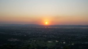 On reprend le vélo quelques minutes jusqu’au pied de Mandalay Hill, la colline d’où il est conseillé d’aller voir le coucher du soleil sur la ville. On est bien en avance vu qu’on a pas surchargé le planning, donc on prend notre temps pour monter (à pied, et pieds nus évidemment) le long escalier couvert qui mène au sommet. On croise des petites pagodes sur le chemin, des birmans qui prennent des photos avec nous, des écureuils dans les arbres (Romain est surexcité), et une famille dont le fils de 17 ans, Banyar Nain, discute avec nous dans un très bon anglais et s’improvise guide. C’est super agréable de papoter ensemble en montant, il nous montre une énorme empreinte de pied censée appartenir à un des trois grands héros des légendes birmanes, puis, arrivés à la terrasse du sommet, la statue des deux serpents où les gens viennent mettre des offrandes (concrètement, des billets dans la gueule des serpents 😛). Il est tôt, la pagode au sommet est magnifique, et il n’y a (encore) presque personne ! On se pose tranquillement à un bon emplacement pour regarder le soleil descendre sur le panorama. Le coucher de soleil est très beau, mais la dernière demi-heure, ça se peuple ! Et devinez qui débarque en grandes bandes bruyantes (et vient passer le téléphone DEVANT ta tête pour prendre une photo 😒) ?