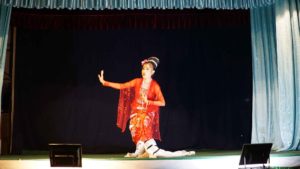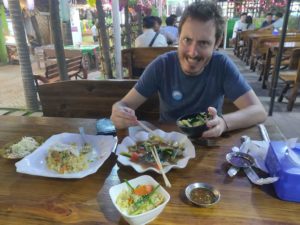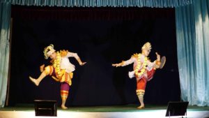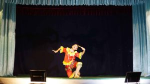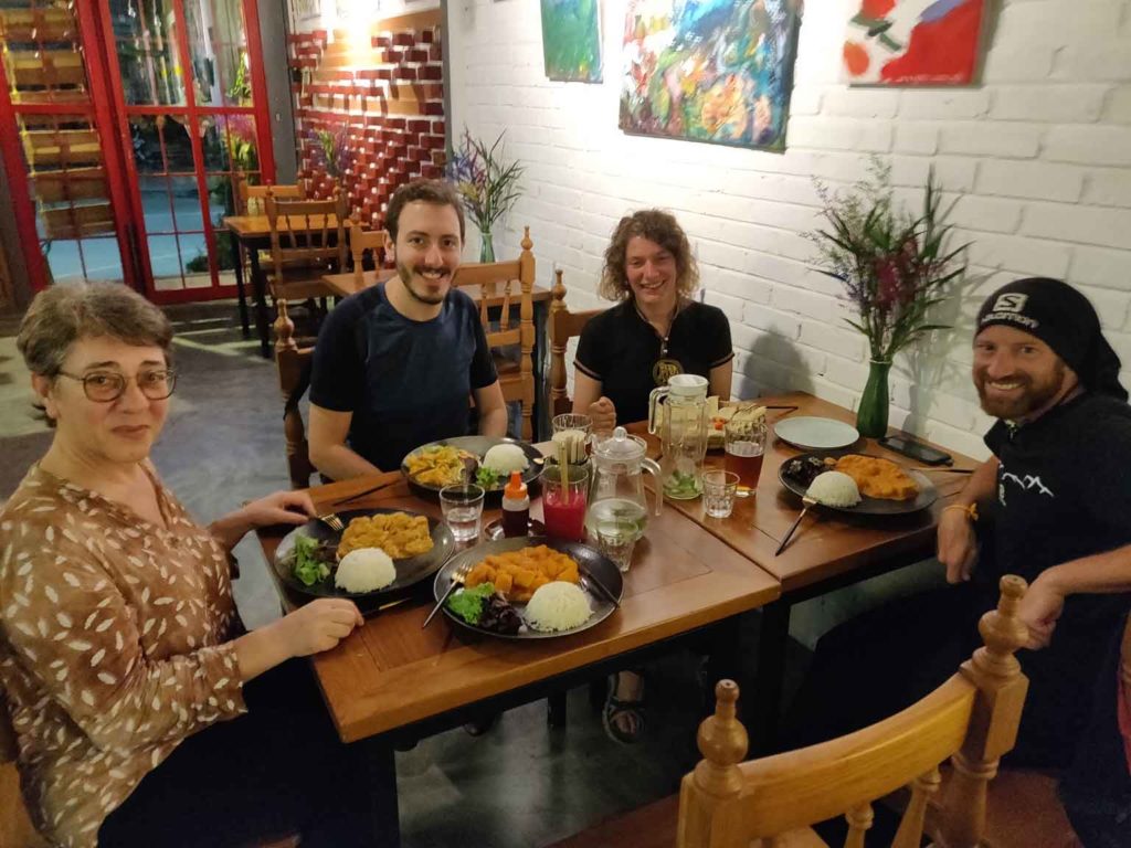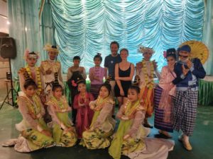 La conversation a bien entamé le temps de rab’ qu’on avait pour dîner, et on se dépêche de reprendre les vélos (oups il fait nuit, on aurait dû prendre les lampes frontales…) pour aller chercher de quoi manger à côté du Mintha Theater, où on a des places pour un spectacle de danse et chant traditionnels par les élèves de l’école du même nom, à 20h. On trouve un petit restau cool, (on était très curieux à l’idée de tester le Nazi Style Rice, mais ils n’en avaient plus 😔), puis on file au théâtre. On est six, installés sur des chaises en plastique, en extérieur (il fait tout le temps beau de toute façon !), et c’est génial. Trois musiciens se relaient au xylophone, percussions style tablas et un instrument traditionnel (une petite cymbale dans une main et une sorte de clave en bois dans une autre) pendant que les danseurs-chanteurs-acteurs dans de superbes costumes défilent sur la scène. Chaque danse est présentée en anglais en amont par le responsable, c’est super agréable, les étudiants (11 à 19 ans) donnent le meilleur d’eux-mêmes, et on profite ! À la fin ils viennent nous voir pour discuter et prendre une photo ensemble, le sourire jusqu’aux oreilles. Camille discute avec le responsable du fonctionnement de l’école, et se met d’accord pour que venir assister à leurs cours le surlendemain matin. Camille est aux anges 😊
