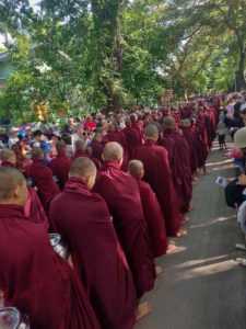 Arrivés à Amarapura, il nous montre une rue qui se remplit de monde rapidement : c’est la foule qui attend la célèbre procession des moines bouddhistes, qui passe à 10h15 pour leur deuxième (et dernier !) repas de la journée. Ce serait très impressionnant et inspirant… Mais. Les deux côtés de la rue sont bondés, presque en intégralité de groupes de touristes chinois (encore 😑), qui poussent, te marchent sur les pieds et dont l’éducation brille par son absence. On est franchement mal à l’aise, parce qu’on se sent plus dans une foire que dans un défilé religieux, et les moines n’ont pas l’air très heureux d’être là (imaginez, vivre ça, TOUS les jours !!!). On ne reste pas très longtemps et on reprend le tuk-tuk, en espérant que ça ne va pas être comme ça toute la journée…