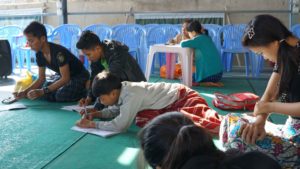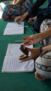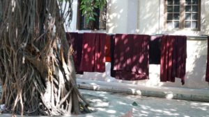 Je (Camille) me réveille ; Romain m’abandonne direct, il grommelle vaguement et se recouche. Qu’à cela ne tienne, c’est parti pour une virée en vélo jusqu’au Mintha Theater pour voir les étudiants en cours de chant et danse ! Je veux prendre un autre chemin, évidemment une mauvaise idée (je rate un virage), et j’arrive juuuste à l’heure. C’est un super moment, je discute avec les élèves en attendant que le cours de musique commence, puis j’apprends avec eux la chanson traditionnelle au programme ce jour-là. Ou plus précisément, je fais avec eux les petites percussions (deux clochettes reliées par une ficelle dans la main droite, une espèce de castagnette dans la main gauche), et pour le reste j’essaye vaguement de répéter (c’est pas facile à lire le birman…).