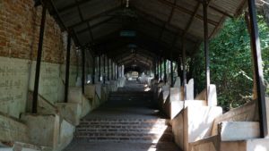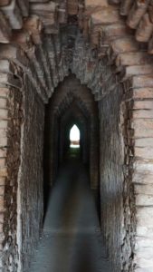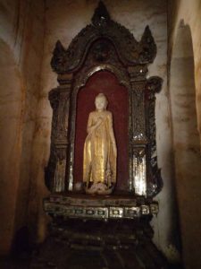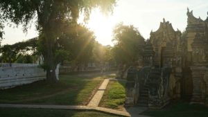 On s’inquiète un peu de l’heure, parce qu’à force de se balader et de s’arrêter, on est un peu en retard sur l’horaire pour reprendre le bateau. Le but était d’arriver au U Bein Bridge pour voir le coucher du soleil, mais comme on a entendu dire que c’est aussi blindé que les processions du matin, on n’est pas hyper motivés. On prévient le guide et on rentre sans se presser ; Sara et moi allons voir le premier temple de Inwa qu’on avait évité à l’arrivée pour fuir les touristes et les vendeurs ambulants. Il est très imposant et assez différent des autres ; en passant dessous, j’ai une petite sensation de déjà-vu des catacombes de Paris ; c’est tout droit, mais au centre il fait noir comme dans un four !