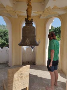 Plus tard, on arrive à un immense temple où on peut grimper les marches, et trois gamins nous courent autour en riant et jouent les guides avec les mains, pendant que leur mère (peut-être ?) trie le riz au pied de l’édifice. Ils nous suivent en souriant et en chuchotant, et nous montrent comment faire sonner la cloche traditionnelle avec un bâton, en tapant une fois ou trois fois, pour faire savoir aux dieux qu’on pense à eux.