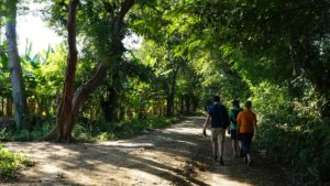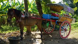 Ensuite, direction Inwa, ou Ava, la capitale antique du Myanmar. Ma partie préférée de la journée ! On commence par manger dans le petit restau du coin (Fried Rice mon amour), puis on prend le bateau qui nous emmène via le seul accès possible. On repousse bravement les 50 tentatives de nous faire prendre un horse carriage (petites carrioles tirées par un cheval), et on se balade à pied en suivant les traces de l’app Maps.me que Juan et Sara maîtrisent nickel depuis leur trek au Népal. On discute ensemble en se perdant dans la nature, au détour des maisons traditionnelles aux murs de bambou tressé, et en rentrant comme on veut dans les petits temples paumés, c’est génial. À un moment, on rencontre un homme assis dans l’enceinte d’un temple avec ses vaches ; on baragouine et il nous apprend qu’il habite dans la petite maison à côté, et qu’il garde plus ou moins le temple et s’en occupe. Il nous montre un vieux pan de mur, datant de l’ancienne cité vers le XVème siècle.