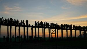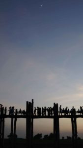 On arrive au U Bein Bridge, et on est confortés dans notre décision de ne pas nous être pressés à Inwa : musique kitsch hyper forte, restaurants et échoppes de souvenirs dans tous les sens, et une concentration de touristes chinois digne de Pékin. Le soleil est couché donc les gens partent petit à petit du pont, ce qui nous donne des images magnifiques en ombres chinoises (oups) sur le ciel qui s’embrase.
