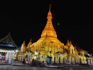 On rentre de nuit (le soleil se couche très tôt, à 17h15, comme à Bangkok), Romain s’endort direct, Camille ressort se balader dans le night market avec Sylvie, une française rencontrée dans le hall de l’hôtel. L’occasion d’apprendre que si si, on peut manger les fruits même si l’eau n’est pas potable (on va pouvoir acheter une pastèèèque). Camille repère la pagode Ein Daw Yar, juste à côté de l’hôtel, pour aller s’y promener plus tard, puis dodo !