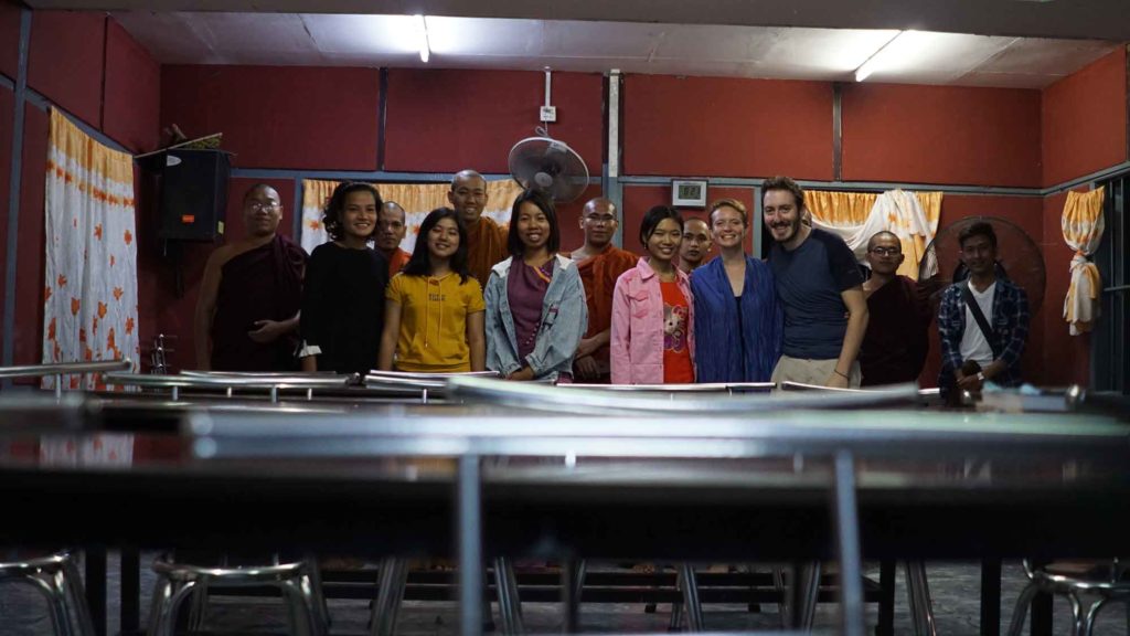 En repassant par l’hôtel, Romain s’est levé et est tout fier d’avoir battu notre record de repas pas cher : 700 kyaths soit 42 centimes. Sauf que Camille a mangé pour rien, héhé. On a rendez-vous à 16h au Mahamuni Temple pour retrouver Ley, un des moines bouddhistes croisés à Mandalay Hill, qui nous a invité à venir intervenir dans son cours d’anglais. On croise Sylvie qui se joint à nous, et après moult rebondissements pour arriver à se retrouver (les temples c’est grand, on a pris la mauvaise entrée, les gardes voulaient nous faire payer alors qu’on était invités par le moine, on s’est perdus les uns les autres, breeef), on arrive au cours d’anglais. Ils sont une grosse vingtaine, avec environ la moitié de moines, et la moitié de filles de 16 à 27 ans, qui suivent aussi les cours. On se présente tous les trois, puis on se divise en plus petits groupes et on discute… pendant 3h30 !!! Romain parle de son métier, des saisons en France, de Paris. Sylvie raconte son métier de chercheuse et du bouddhisme comparé au catholicisme. Camille parle pas mal de musique, d’anecdotes de vie et de la culture française. Camille a discuté avec toutes les filles du groupe, qui étaient restées derrière car plus timides, et a du mal à les faire parler : elles posent surtout des questions ; après leur avoir montré un peu de chant et de percus corporelles, on chante un peu et on rit beaucoup. Le temps passe très vite, et on reste jusqu’à 20h30 où il faut quand même dire au revoir !