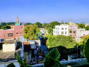 Après le petit-déjeuner de l’hôtel (très souvent inclus au Myanmar, c’est bien pratique) sur la terrasse couverte du quatrième étage, on loue des vélos !