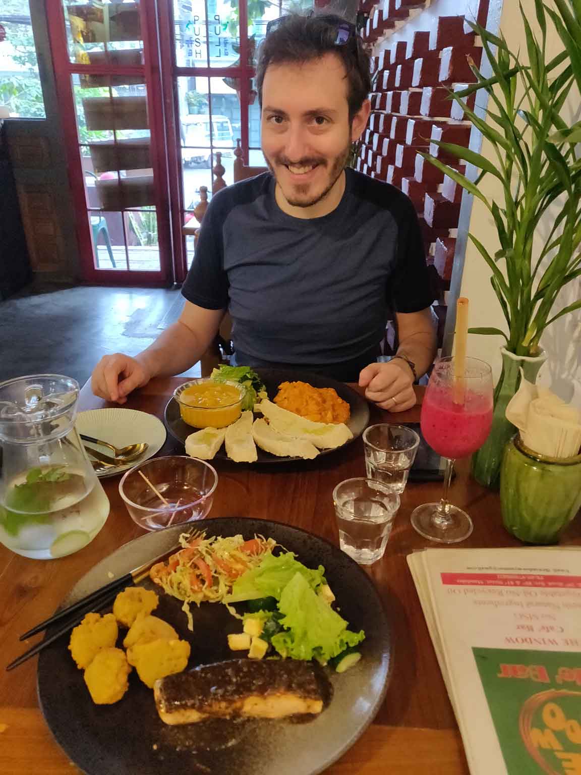 On arrive à l’hôtel AD1 à 16h, le temps de retirer des kyaths à l’aéroport (1€ = 1660Ks, pas facile les conversions), d’acheter une carte Sim avec Internet pour Romain, et enfin d’embarquer dans un taxi partagé de l’aéroport vers le centre-ville. On est épuisés et on a FAIM. En farfouillant sur TripAdvisor, on trouve le Window Café, hyper bien noté : on ira trois fois en trois jours !