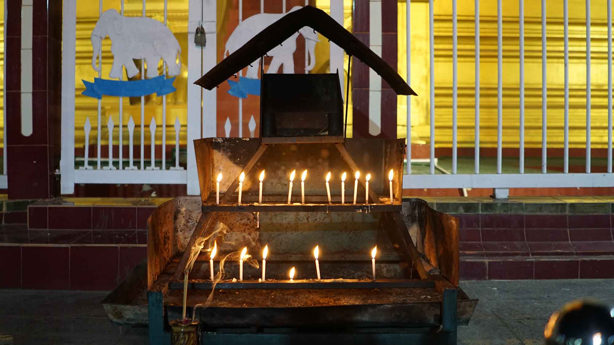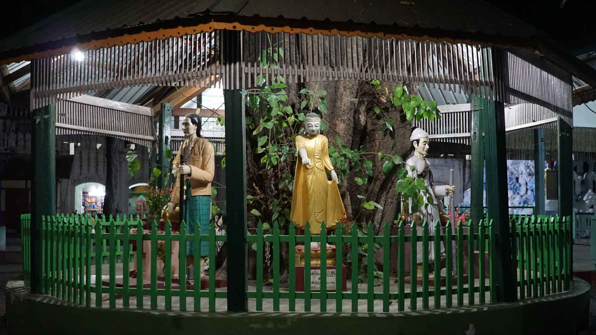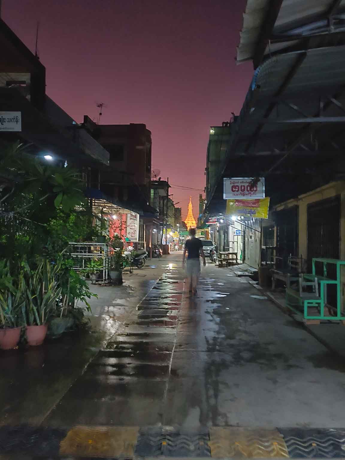 On rentre de nuit (le soleil se couche très tôt, à 17h15, comme à Bangkok), Romain s’endort direct, Camille ressort se balader dans le night market avec Sylvie, une française rencontrée dans le hall de l’hôtel. L’occasion d’apprendre que si si, on peut manger les fruits même si l’eau n’est pas potable (on va pouvoir acheter une pastèèèque). Camille repère la pagode Ein Daw Yar, juste à côté de l’hôtel, pour aller s’y promener plus tard, puis dodo !