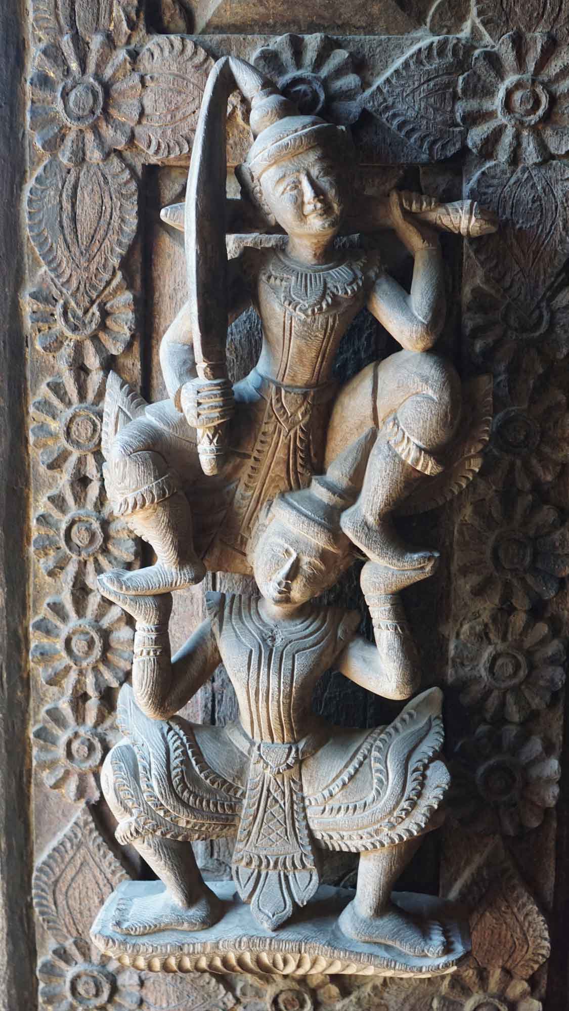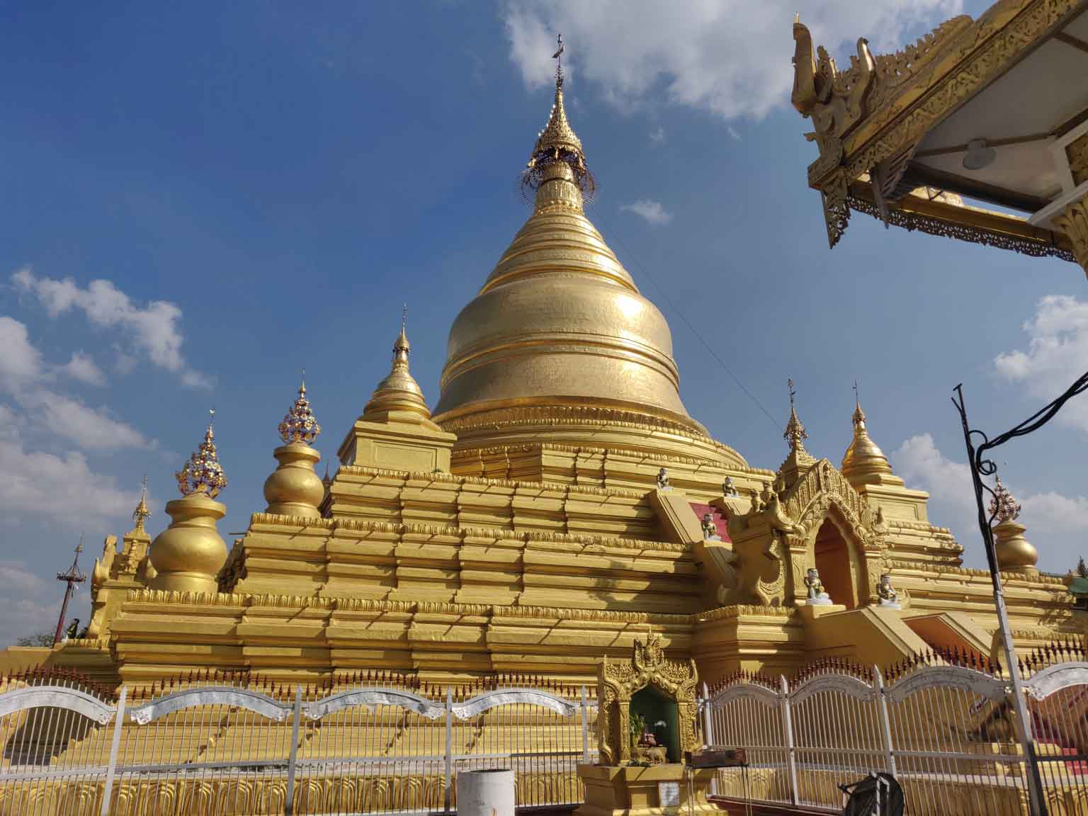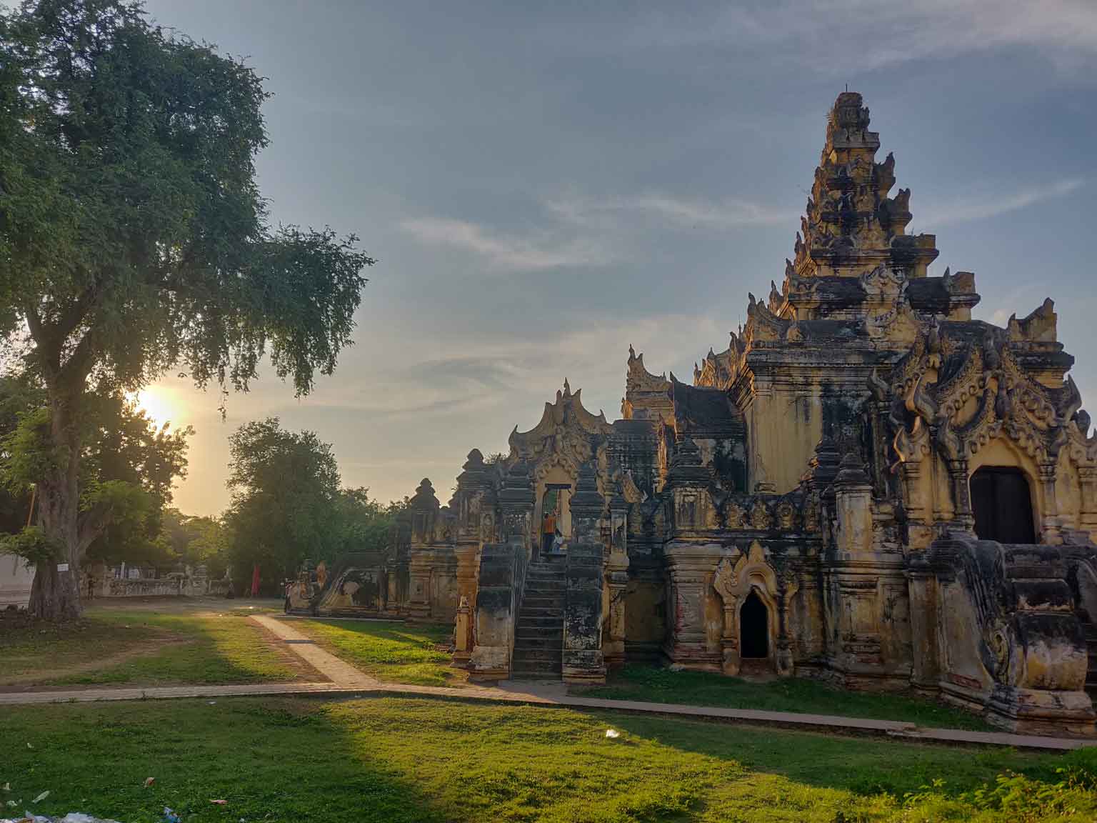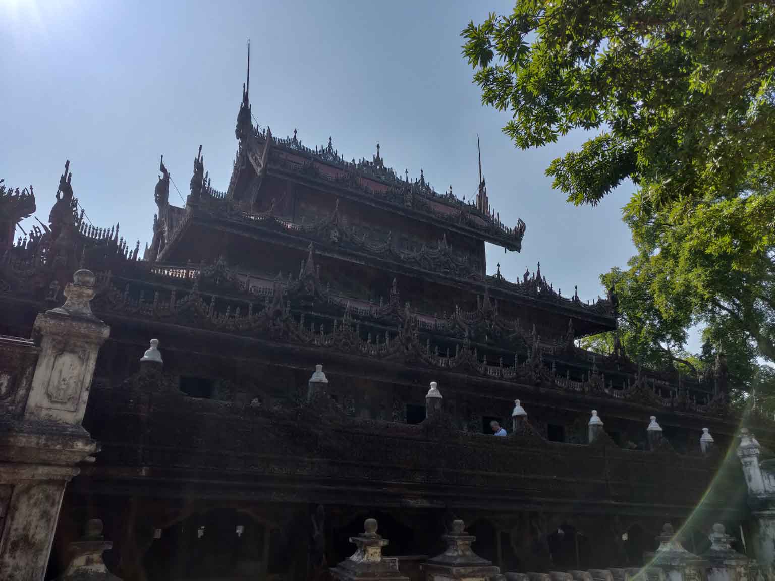 On visite quatre temples : d’abord la belle pagode en teck Golden Palace Monastery, où on paye la « taxe archéologique de Mandalay » de 10 000 kyaths (valables pour plusieurs sites de Mandalay), et où on voit des artisans en pleins travaux de restauration derrière.