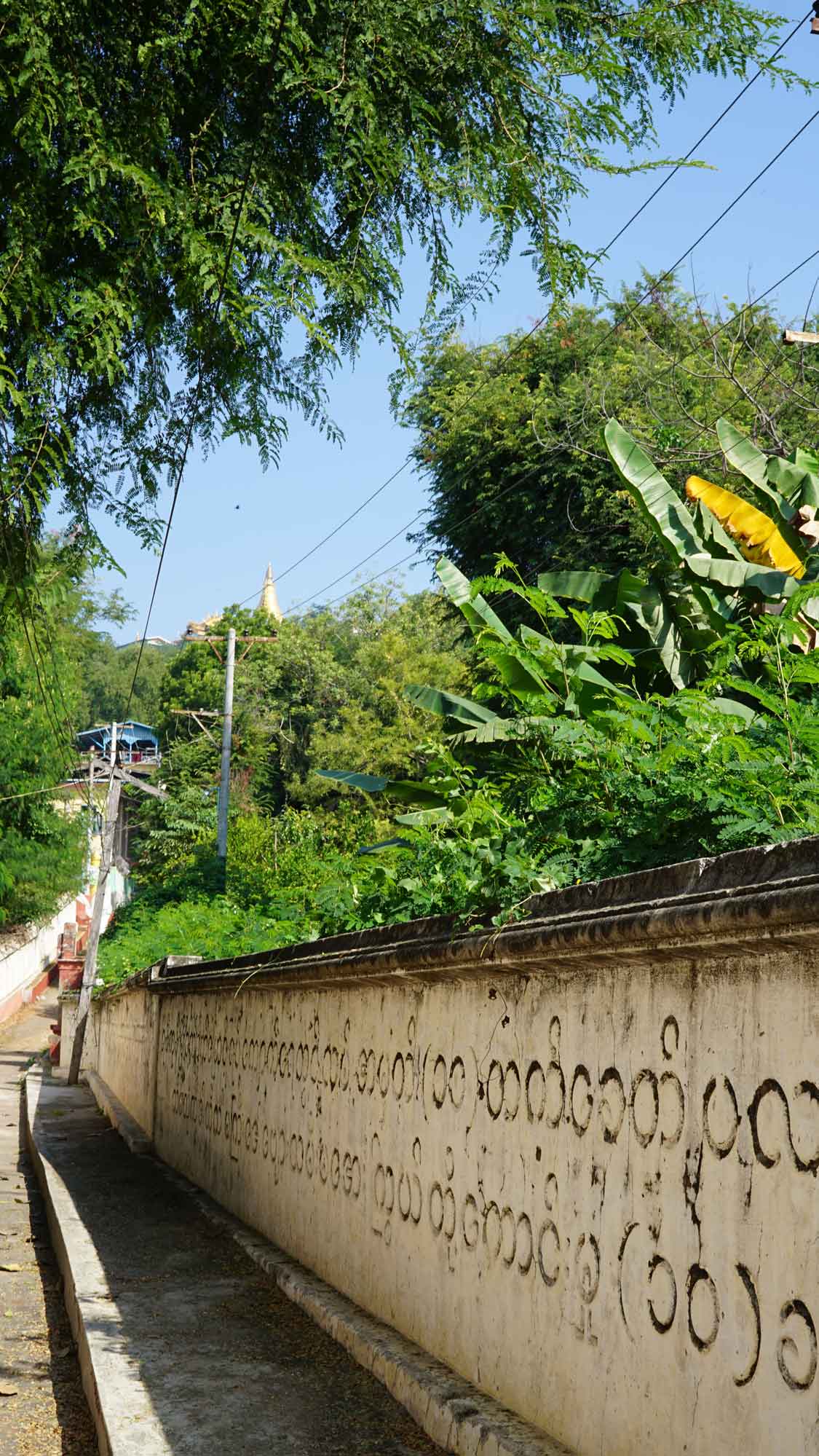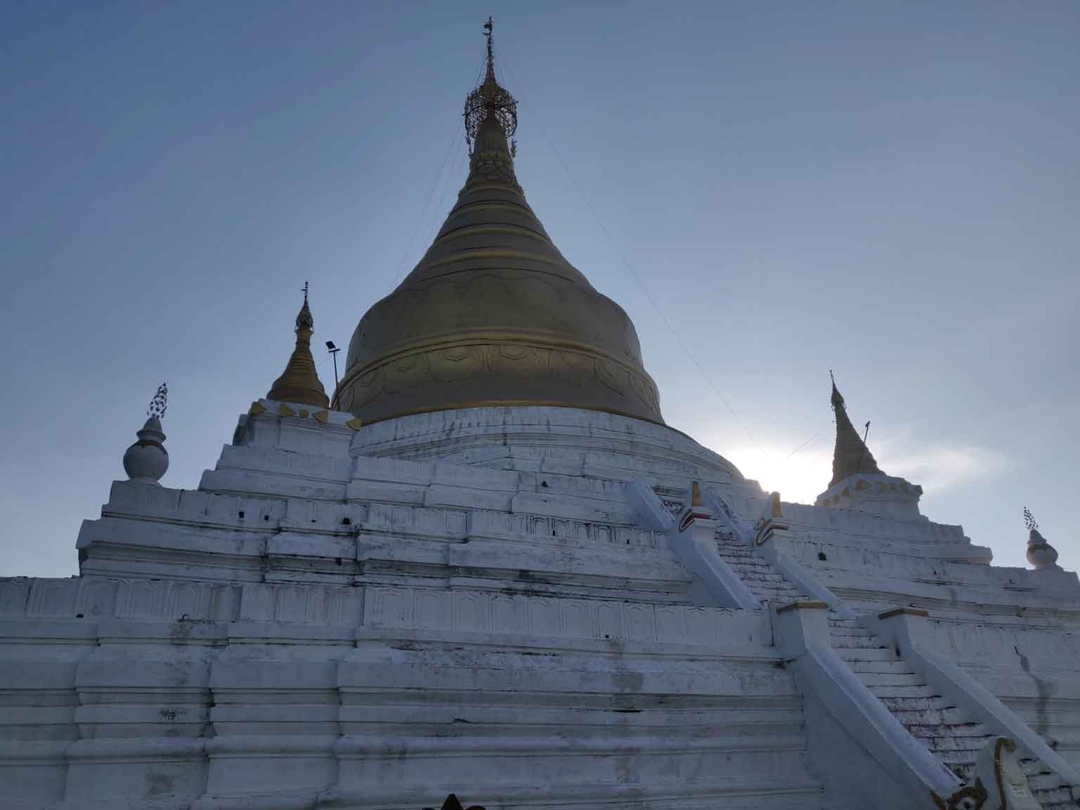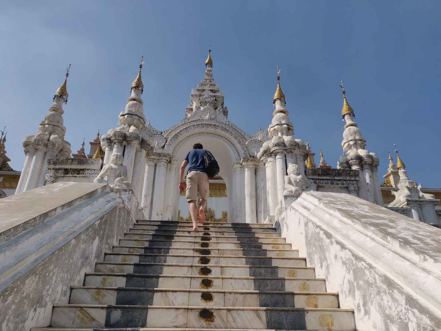 Ensuite, direction Sagaing Hill, plus loin. On traverse un très grand pont avec la vue sur Sagaing, qui a plusieurs petites collines très mimi avec à leur sommet une ou deux pagodes et leurs pointes dorées, c’est beau ! Dans le tuktuk, on discute et on rigole bien avec Nyi Nyi, et Juan nous fait partager son vocabulaire birman : « Mingalabar » pour dire bonjour, « Yisuba » pour dire merci, « Tata » pour dire au revoir . Ça fait plaisir de pouvoir interagir un tout petit peu dans la langue du coin ! On monte les marches de Sagaing Hill, ça ressemble pas mal à Mandalay Hill (il fait plus chaud) mais ça nous va très bien. Arrivés en haut, on se balade dans la pagode, on profite de la vue, puis on redescend. En passant, on fait la connaissance d’un moine avec qui on discute et qui est fan des « French classics songs ». Il me demande de lui chanter « La vie en rose », ça fait un joli décalage avec le paysage des pagodes birmanes… 😉