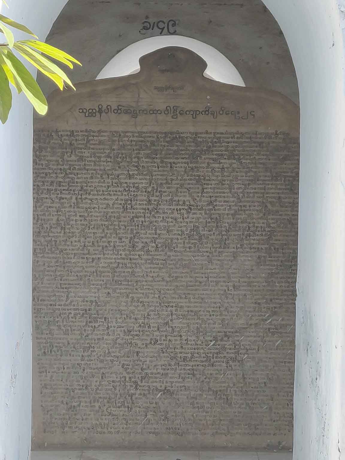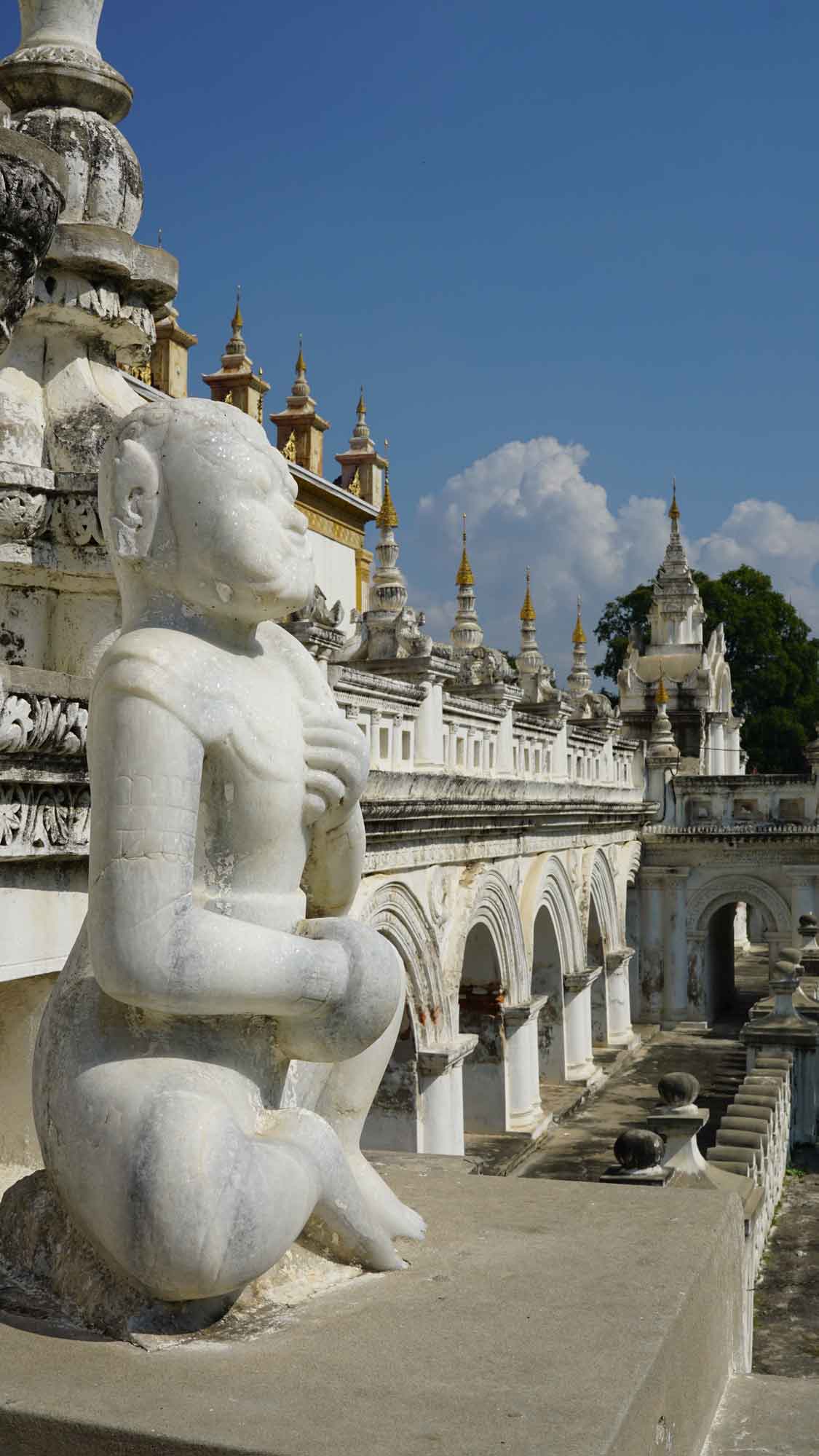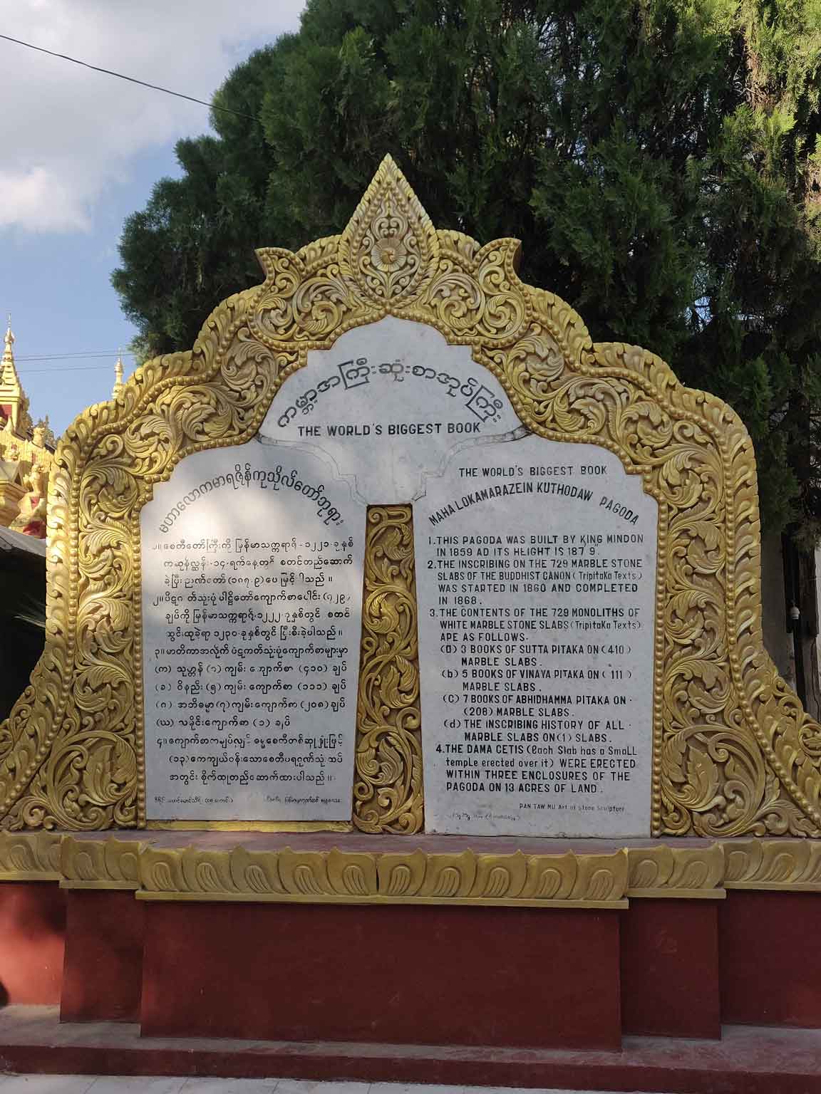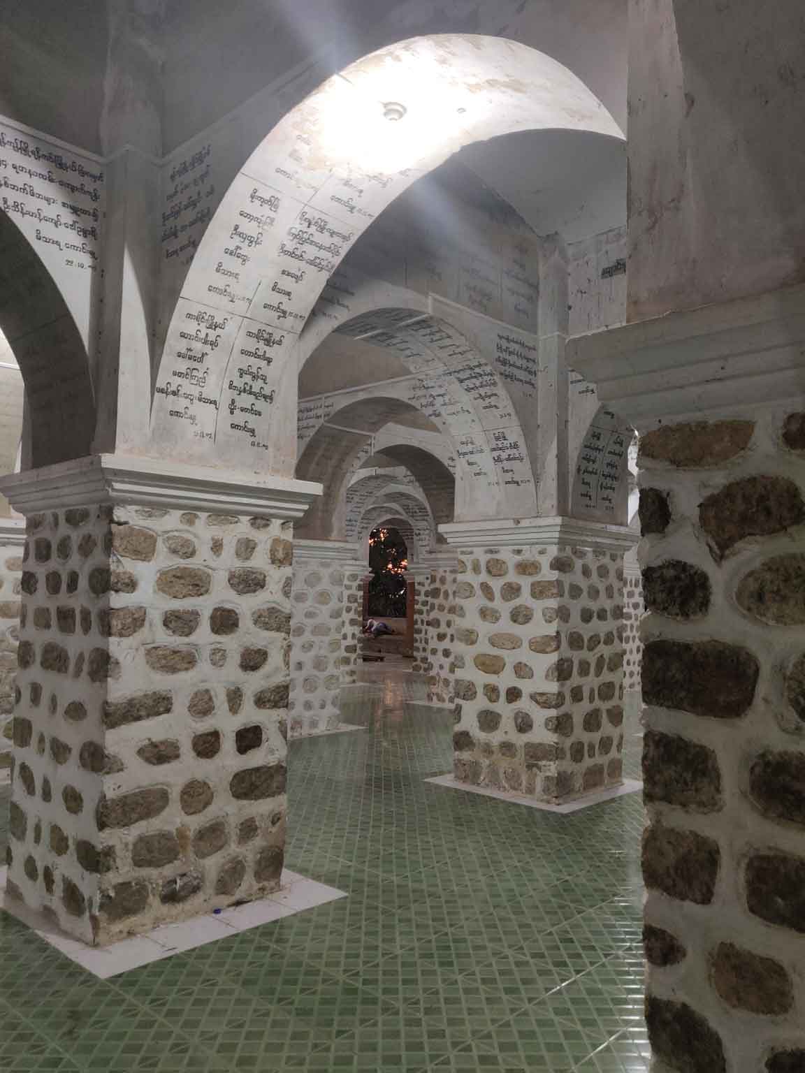 Après manger, direction le Kuthodaw, et là bingo, on est de nouveau presque tout seuls à part les locaux venus prier. On profite de la balade au milieu des innombrables petites pagodes blanches, chacune abritant une stèle gravée en birman. On croit que c’est des tombes, mais il s’agit en fait du plus grand livre du monde : 729 pierres gravées du Tipitaka, les principes du bouddhisme. Trop classe !