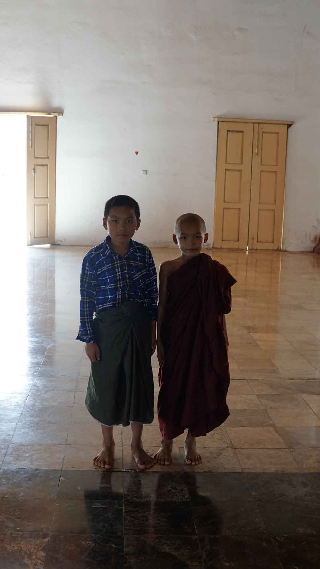 Puis, tout à côté (pratique), le Atumashi Kyaung, grand temple tout vide à part le traditionnel Bouddha au fond (on en aura vu une de ces quantités dis donc), et des enfants qui courent et sont tout contents de poser pour la photo 😀