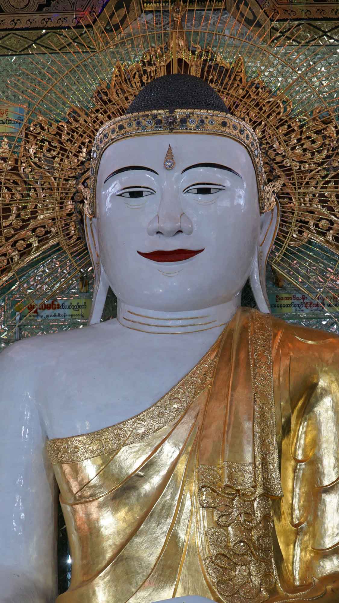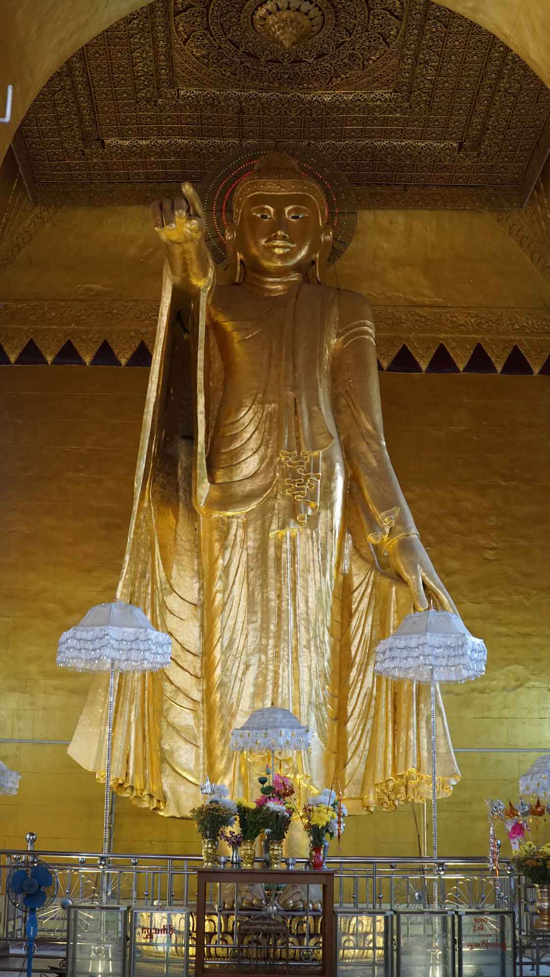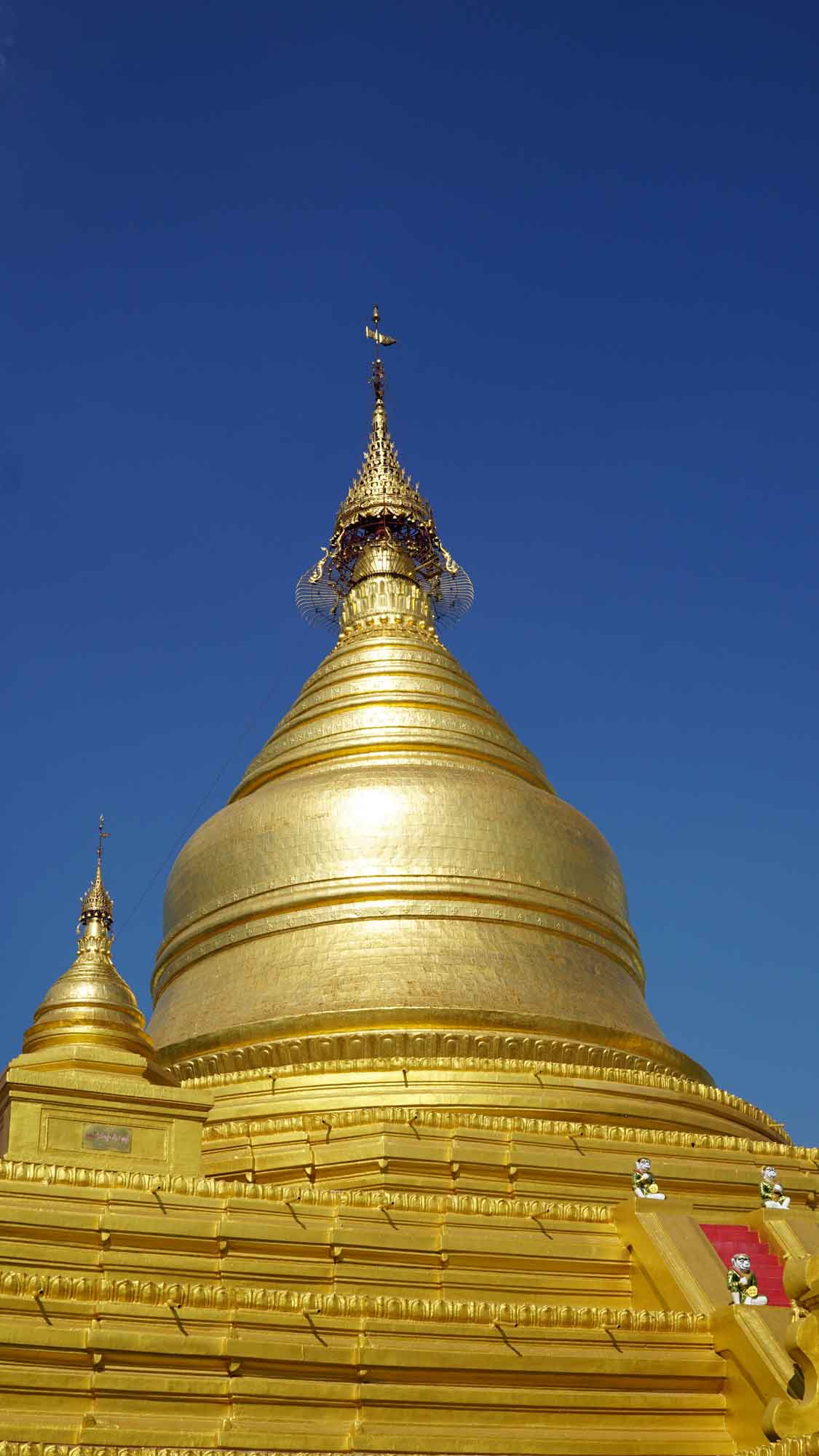 Puis on rejoint Nyi Nyi qui nous emmène à la Buddha University où, si j’ai bien compris, les gens viennent prendre des cours sur le bouddhisme et/ou passer leurs examens écrits de moines. Autour de l’immense coupole dorée, une myriades de bouddhas, venant de presque tous les pays d’Asie ! Ça nous fait une belle petite mosaïque de photos 🙂