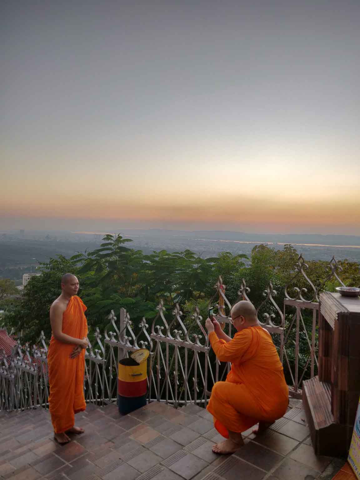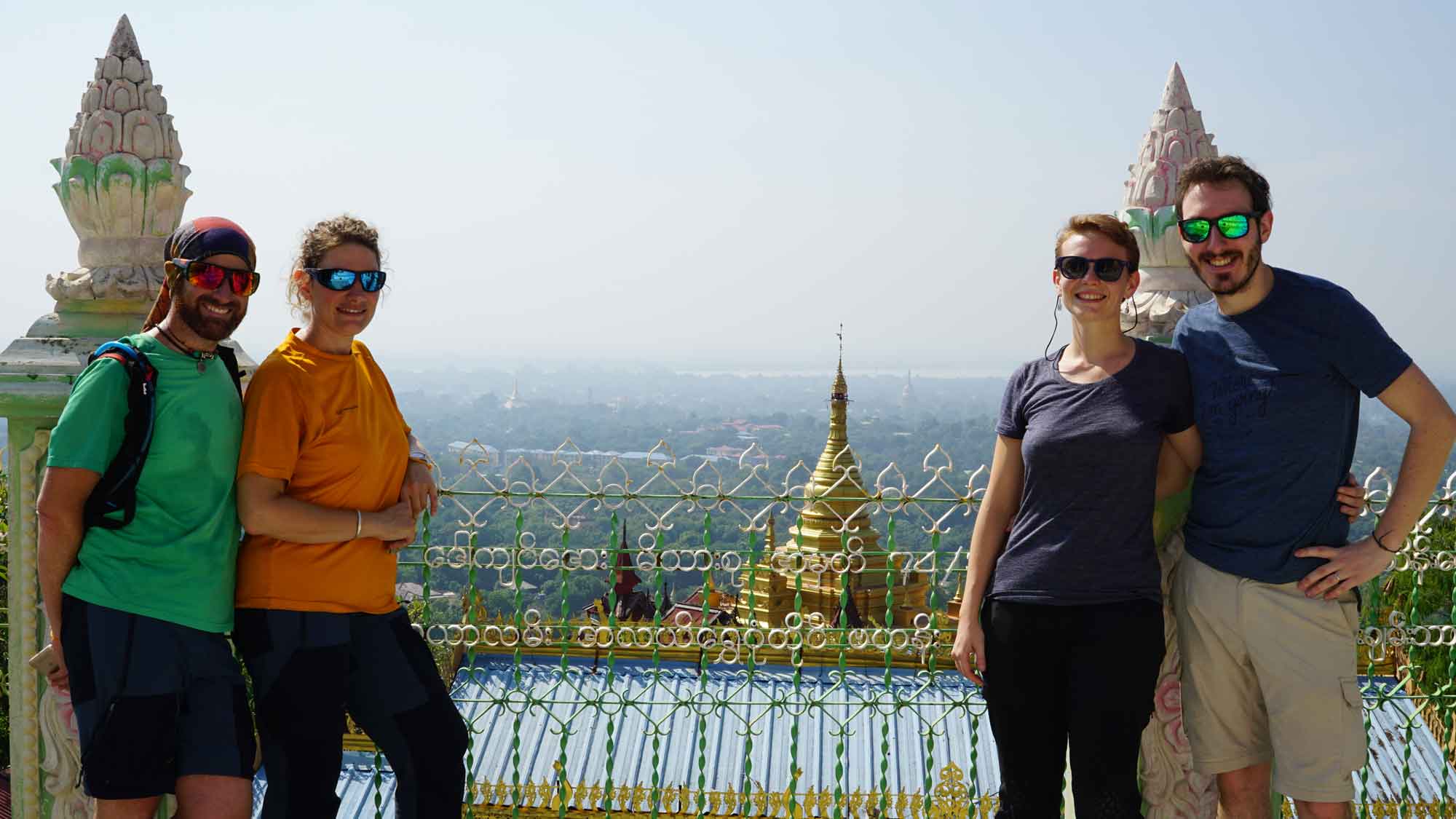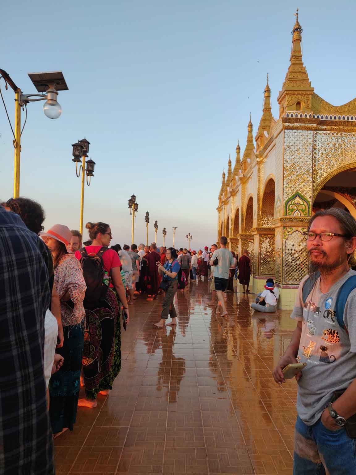 On reprend le vélo quelques minutes jusqu’au pied de Mandalay Hill, la colline d’où il est conseillé d’aller voir le coucher du soleil sur la ville. On est bien en avance vu qu’on a pas surchargé le planning, donc on prend notre temps pour monter (à pied, et pieds nus évidemment) le long escalier couvert qui mène au sommet. On croise des petites pagodes sur le chemin, des birmans qui prennent des photos avec nous, des écureuils dans les arbres (Romain est surexcité), et une famille dont le fils de 17 ans, Banyar Nain, discute avec nous dans un très bon anglais et s’improvise guide. C’est super agréable de papoter ensemble en montant, il nous montre une énorme empreinte de pied censée appartenir à un des trois grands héros des légendes birmanes, puis, arrivés à la terrasse du sommet, la statue des deux serpents où les gens viennent mettre des offrandes (concrètement, des billets dans la gueule des serpents 😛). Il est tôt, la pagode au sommet est magnifique, et il n’y a (encore) presque personne ! On se pose tranquillement à un bon emplacement pour regarder le soleil descendre sur le panorama. Le coucher de soleil est très beau, mais la dernière demi-heure, ça se peuple ! Et devinez qui débarque en grandes bandes bruyantes (et vient passer le téléphone DEVANT ta tête pour prendre une photo 😒) ?