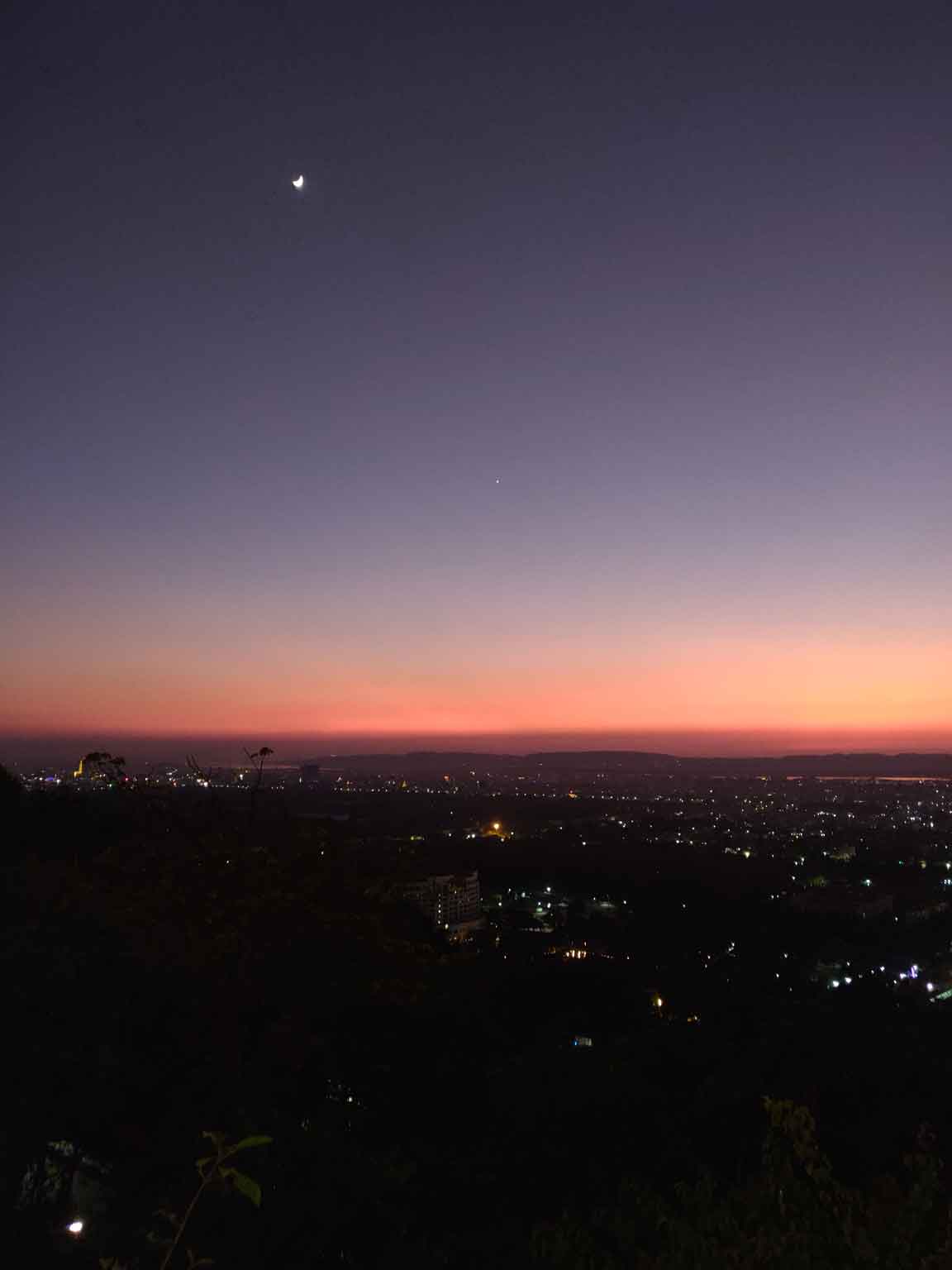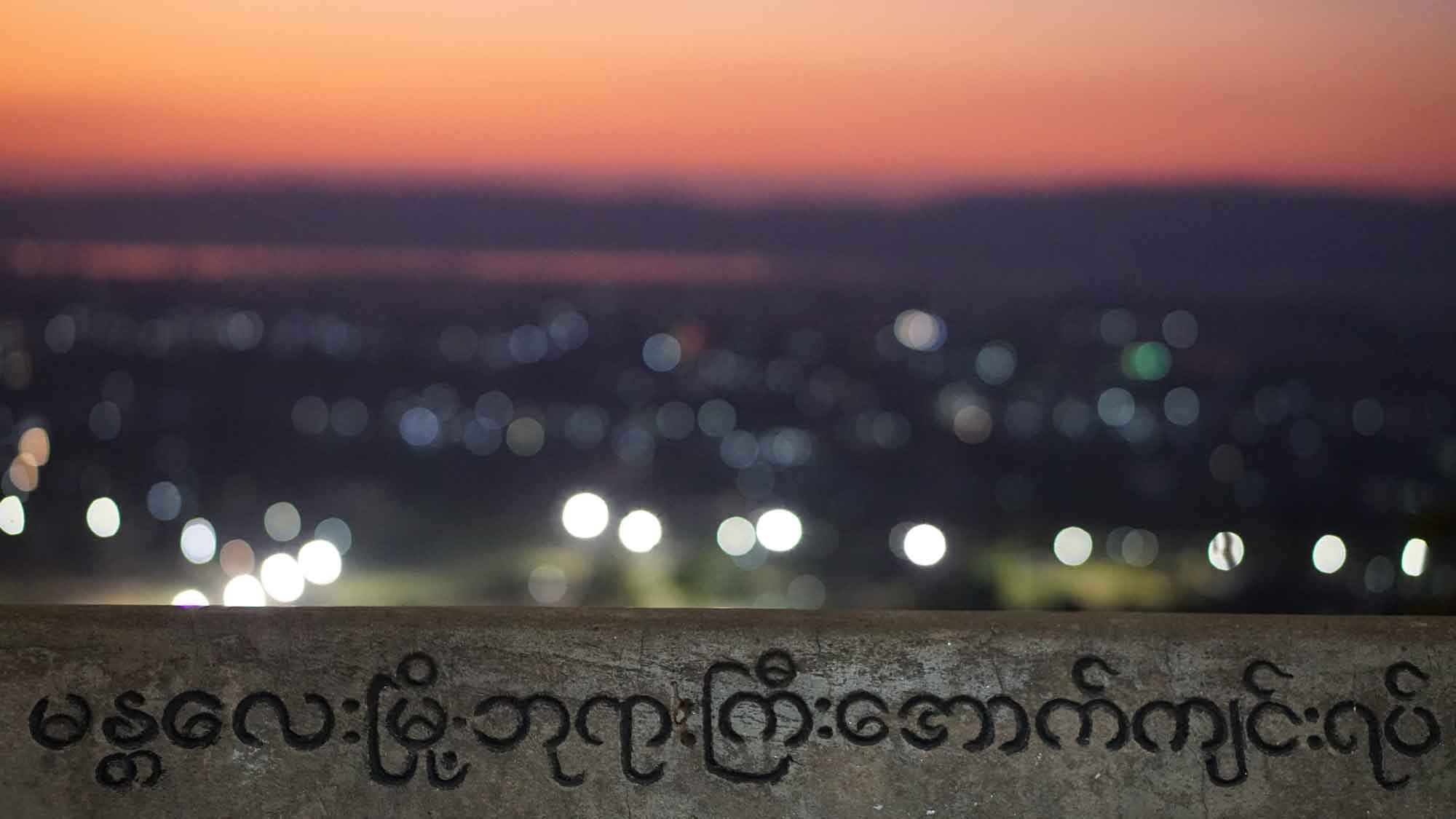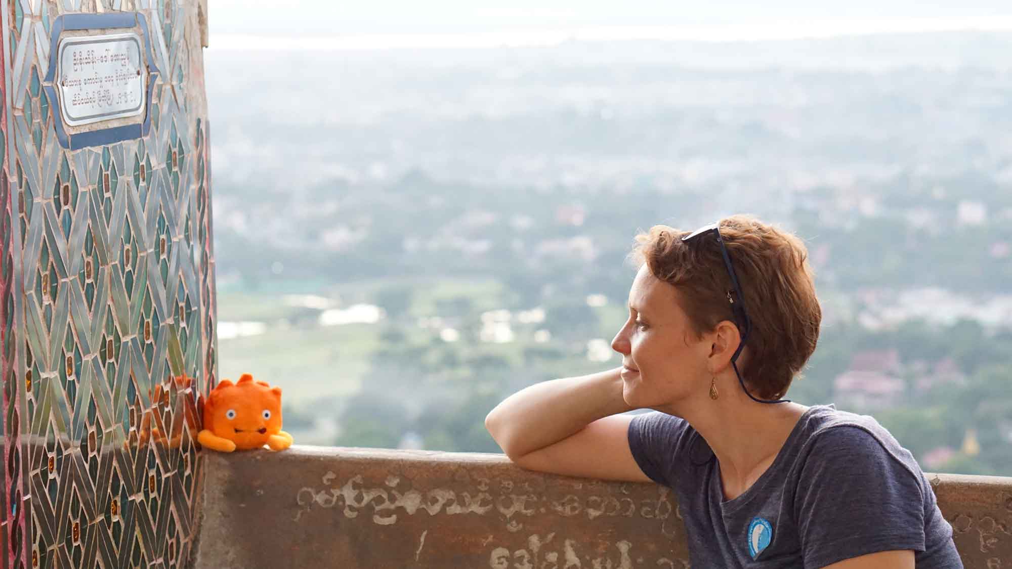 On reprend le vélo quelques minutes jusqu’au pied de Mandalay Hill, la colline d’où il est conseillé d’aller voir le coucher du soleil sur la ville. On est bien en avance vu qu’on a pas surchargé le planning, donc on prend notre temps pour monter (à pied, et pieds nus évidemment) le long escalier couvert qui mène au sommet. On croise des petites pagodes sur le chemin, des birmans qui prennent des photos avec nous, des écureuils dans les arbres (Romain est surexcité), et une famille dont le fils de 17 ans, Banyar Nain, discute avec nous dans un très bon anglais et s’improvise guide. C’est super agréable de papoter ensemble en montant, il nous montre une énorme empreinte de pied censée appartenir à un des trois grands héros des légendes birmanes, puis, arrivés à la terrasse du sommet, la statue des deux serpents où les gens viennent mettre des offrandes (concrètement, des billets dans la gueule des serpents 😛). Il est tôt, la pagode au sommet est magnifique, et il n’y a (encore) presque personne ! On se pose tranquillement à un bon emplacement pour regarder le soleil descendre sur le panorama. Le coucher de soleil est très beau, mais la dernière demi-heure, ça se peuple ! Et devinez qui débarque en grandes bandes bruyantes (et vient passer le téléphone DEVANT ta tête pour prendre une photo 😒) ?