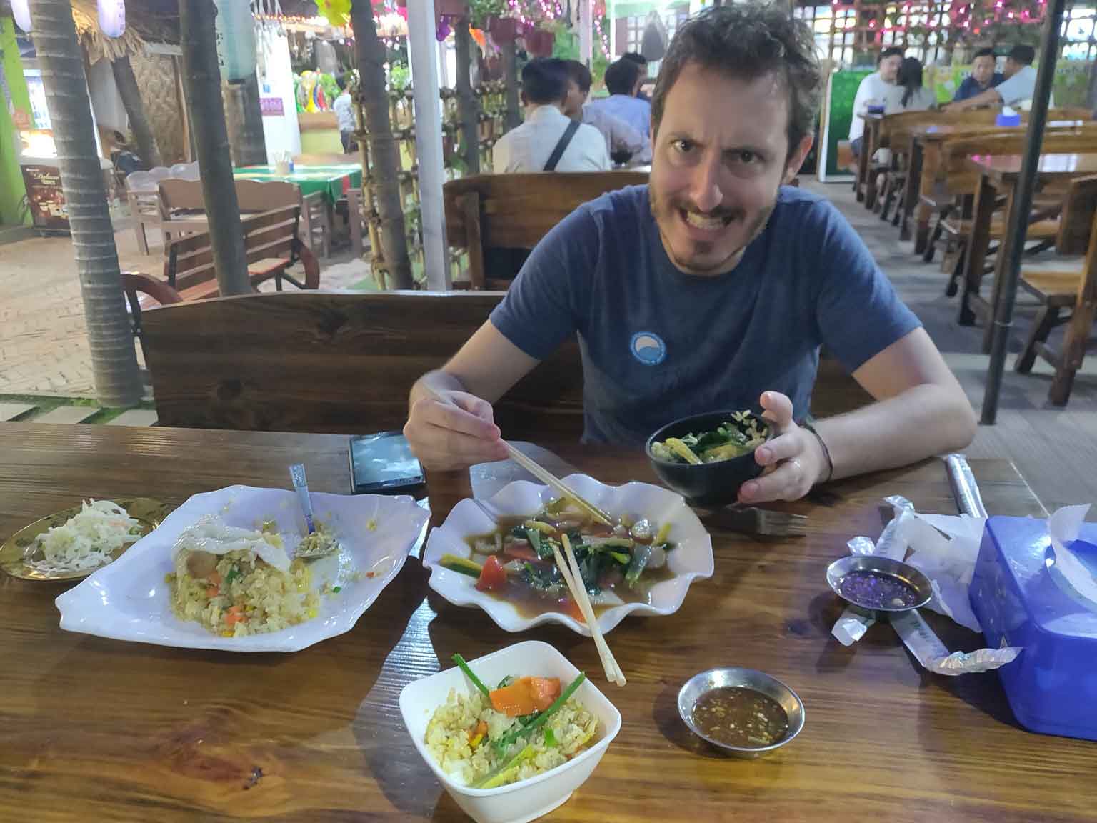 Retour tranquille à la maison, chacun à son hôtel pour se débarbouiller un peu, et on se donne rendez-vous au Window Café (toujours le même) avec Sara, Juan et Sylvie une heure plus tard. J’en profite pour aller faire un petit tour à la pagode repérée la veille, et je suis bien récompensée : le lieu est calme, magnifiquement éclairé de nuit, avec des locaux qui viennent prier, ou se reposer dans l’enceinte du temple. Je me sens un peu hors du temps, c’est magique.