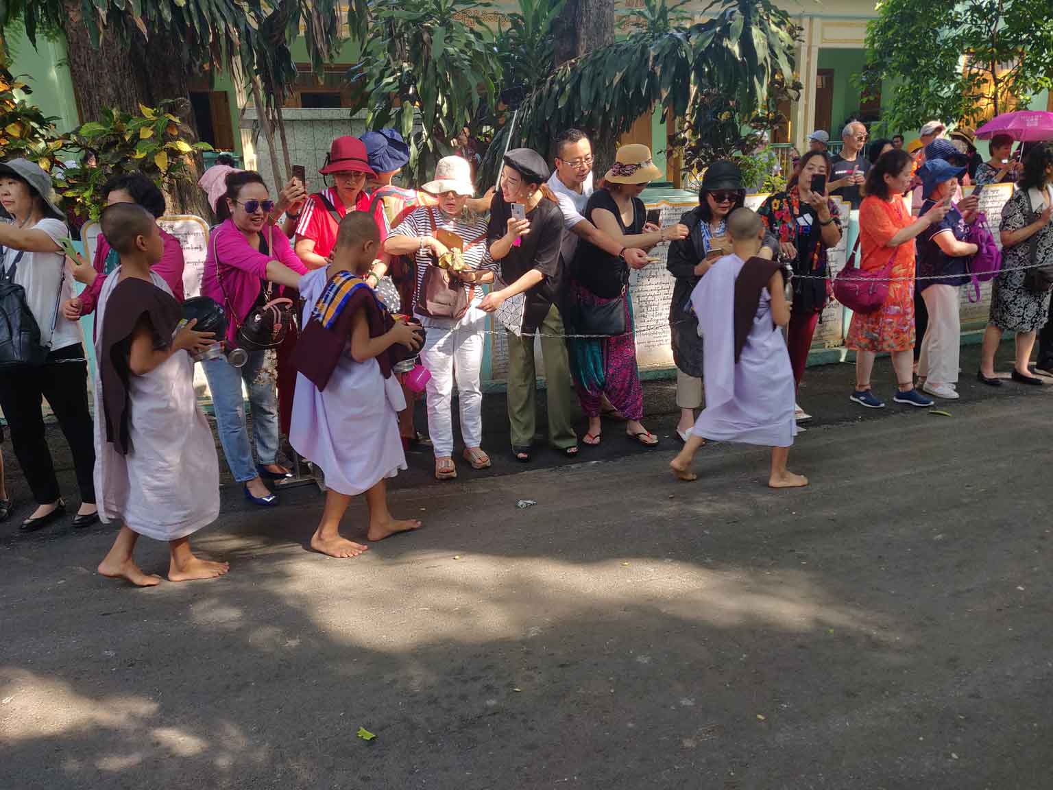 Arrivés à Amarapura, il nous montre une rue qui se remplit de monde rapidement : c’est la foule qui attend la célèbre procession des moines bouddhistes, qui passe à 10h15 pour leur deuxième (et dernier !) repas de la journée. Ce serait très impressionnant et inspirant… Mais. Les deux côtés de la rue sont bondés, presque en intégralité de groupes de touristes chinois (encore 😑), qui poussent, te marchent sur les pieds et dont l’éducation brille par son absence. On est franchement mal à l’aise, parce qu’on se sent plus dans une foire que dans un défilé religieux, et les moines n’ont pas l’air très heureux d’être là (imaginez, vivre ça, TOUS les jours !!!). On ne reste pas très longtemps et on reprend le tuk-tuk, en espérant que ça ne va pas être comme ça toute la journée…