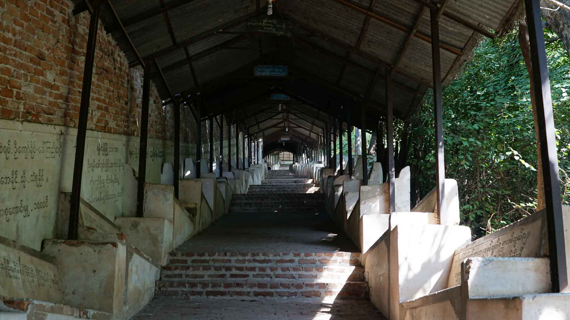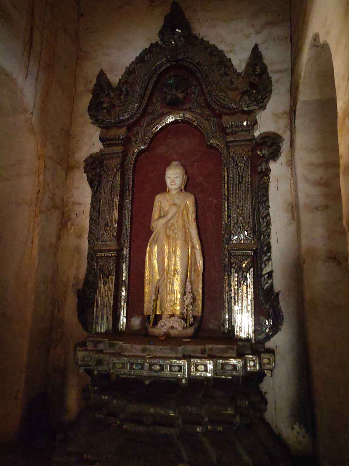 On s’inquiète un peu de l’heure, parce qu’à force de se balader et de s’arrêter, on est un peu en retard sur l’horaire pour reprendre le bateau. Le but était d’arriver au U Bein Bridge pour voir le coucher du soleil, mais comme on a entendu dire que c’est aussi blindé que les processions du matin, on n’est pas hyper motivés. On prévient le guide et on rentre sans se presser ; Sara et moi allons voir le premier temple de Inwa qu’on avait évité à l’arrivée pour fuir les touristes et les vendeurs ambulants. Il est très imposant et assez différent des autres ; en passant dessous, j’ai une petite sensation de déjà-vu des catacombes de Paris ; c’est tout droit, mais au centre il fait noir comme dans un four !