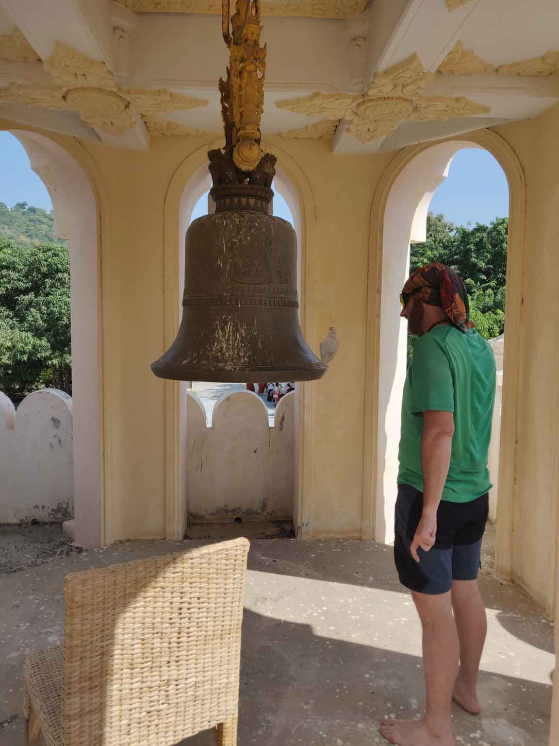 Plus tard, on arrive à un immense temple où on peut grimper les marches, et trois gamins nous courent autour en riant et jouent les guides avec les mains, pendant que leur mère (peut-être ?) trie le riz au pied de l’édifice. Ils nous suivent en souriant et en chuchotant, et nous montrent comment faire sonner la cloche traditionnelle avec un bâton, en tapant une fois ou trois fois, pour faire savoir aux dieux qu’on pense à eux.