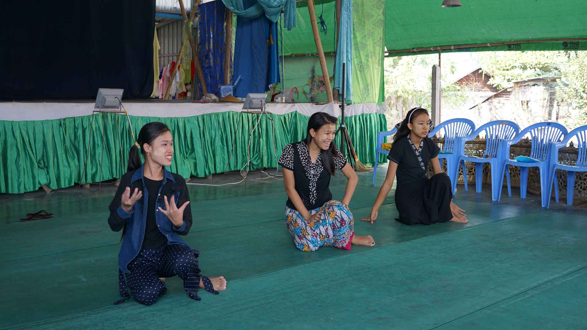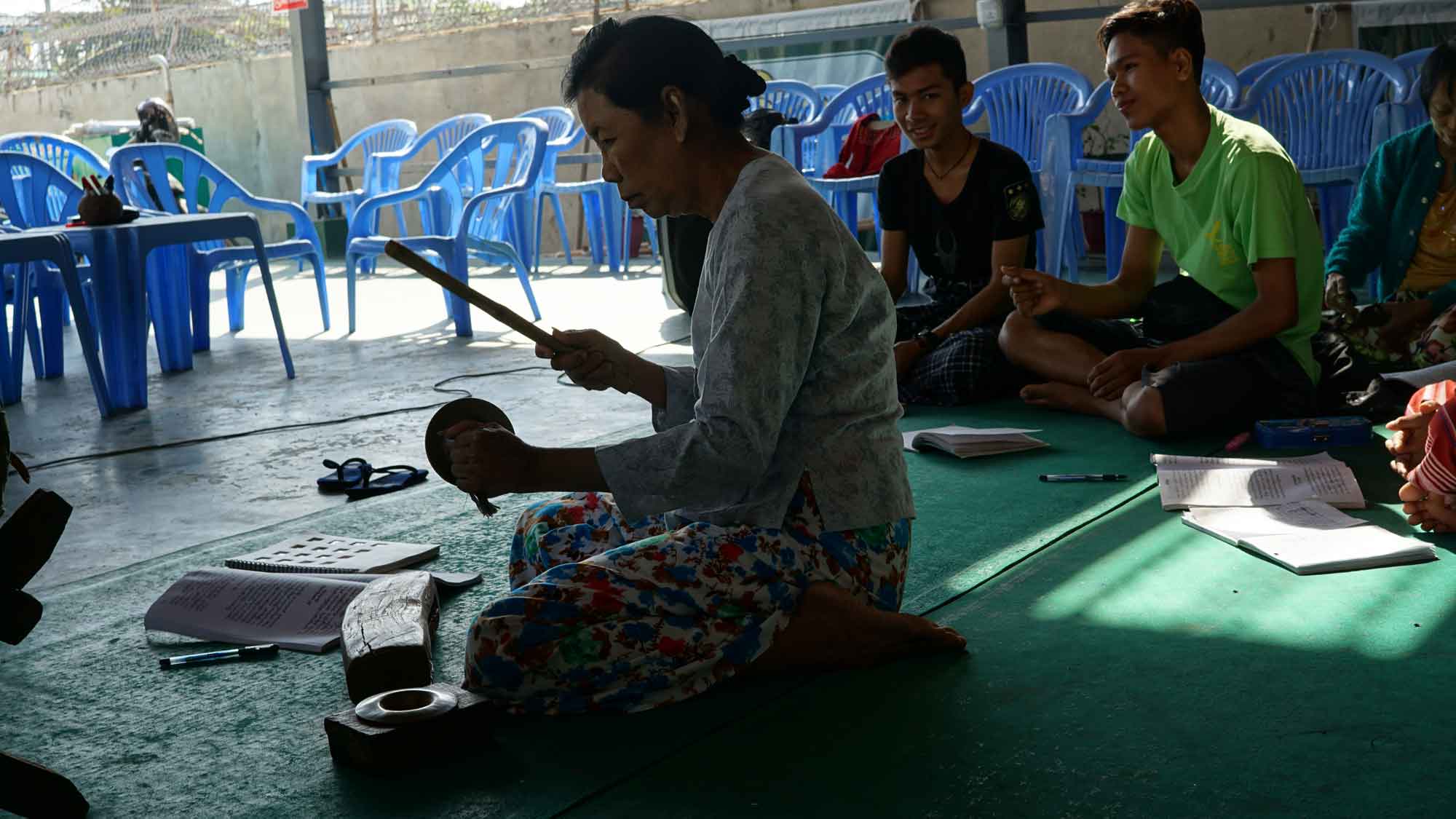 Je (Camille) me réveille ; Romain m’abandonne direct, il grommelle vaguement et se recouche. Qu’à cela ne tienne, c’est parti pour une virée en vélo jusqu’au Mintha Theater pour voir les étudiants en cours de chant et danse ! Je veux prendre un autre chemin, évidemment une mauvaise idée (je rate un virage), et j’arrive juuuste à l’heure. C’est un super moment, je discute avec les élèves en attendant que le cours de musique commence, puis j’apprends avec eux la chanson traditionnelle au programme ce jour-là. Ou plus précisément, je fais avec eux les petites percussions (deux clochettes reliées par une ficelle dans la main droite, une espèce de castagnette dans la main gauche), et pour le reste j’essaye vaguement de répéter (c’est pas facile à lire le birman…).