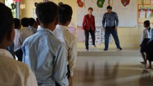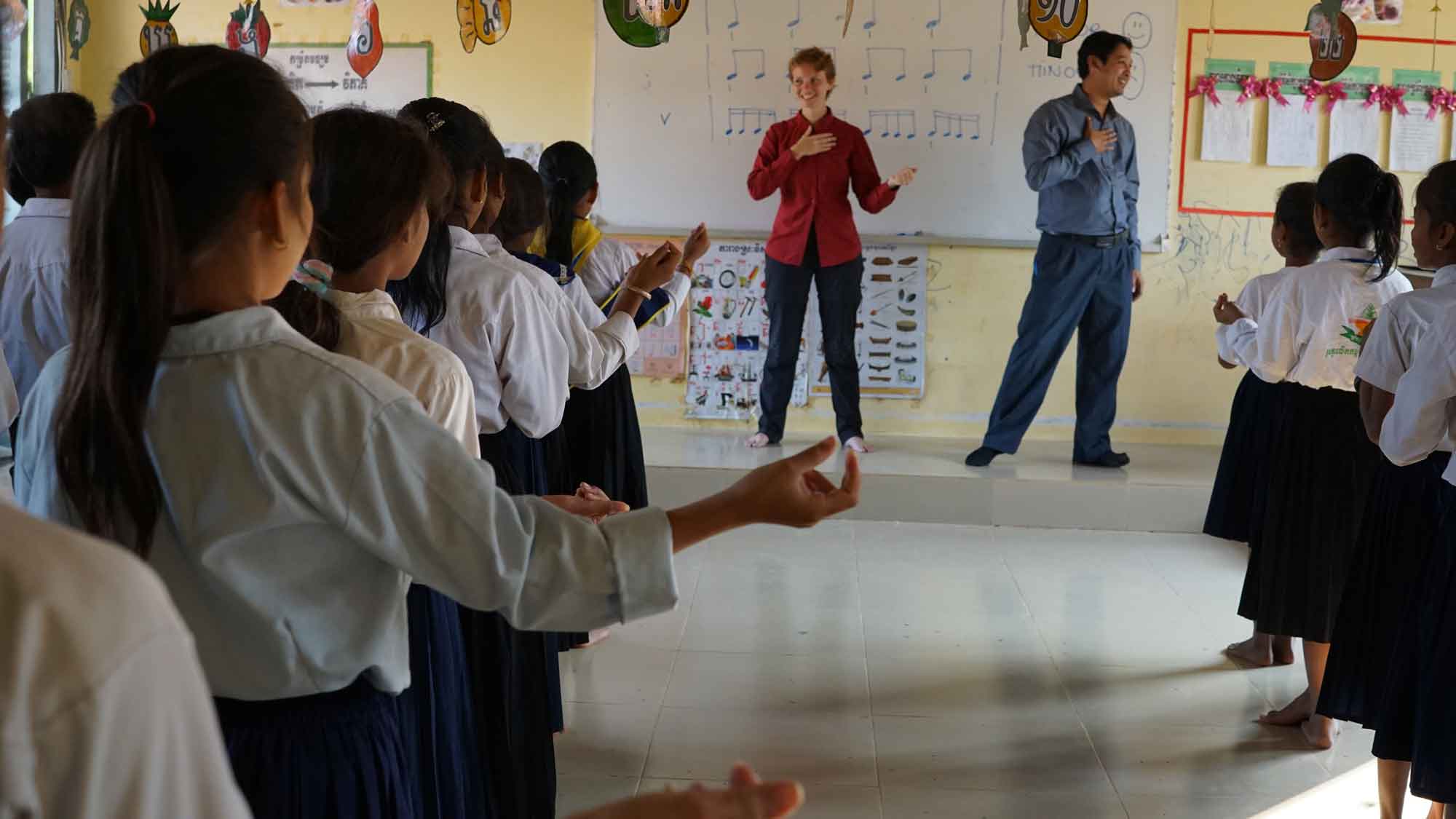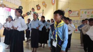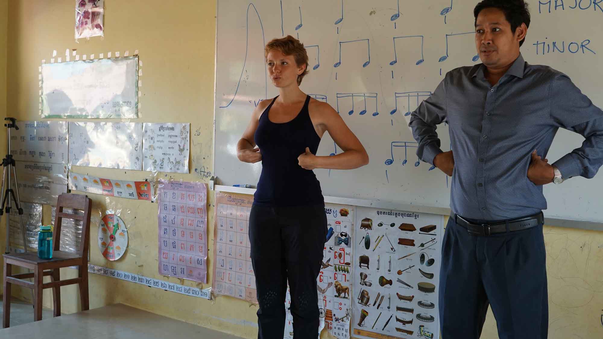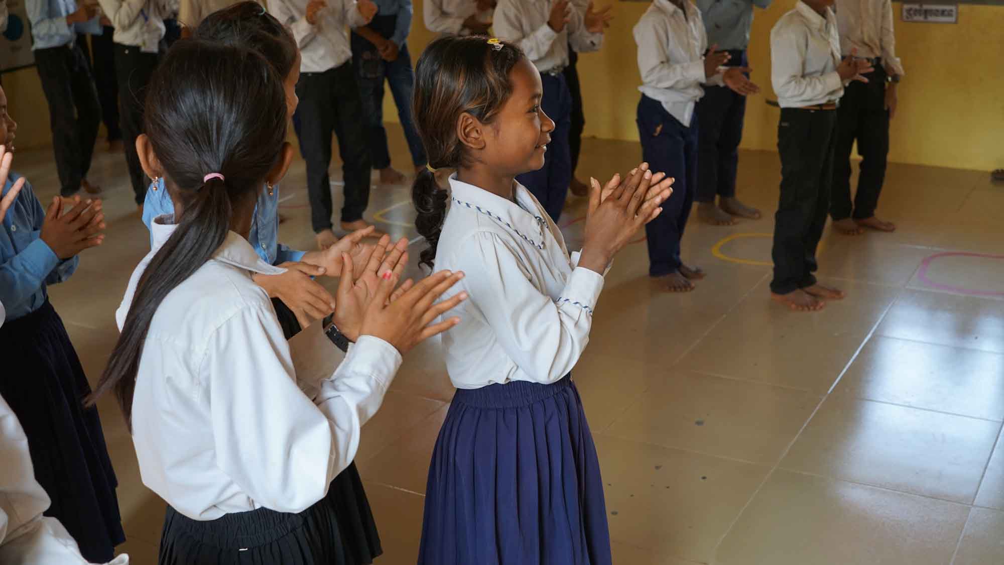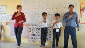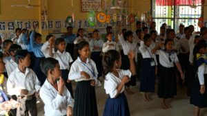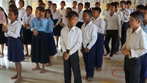 À chaque exercice, j’expliquais le principe, Chantha traduisait, et parfois rajoutait des petites blagues pour les plus petits. Pour certaines activités (chanson à répéter, concours de vitesse sur une percussion corporelle), on demandait quelques volontaires pour venir sur l’estrade faire l’exercice avec nous, puis on le répétait avec tous les enfants, qui avaient l’air ravis de participer !