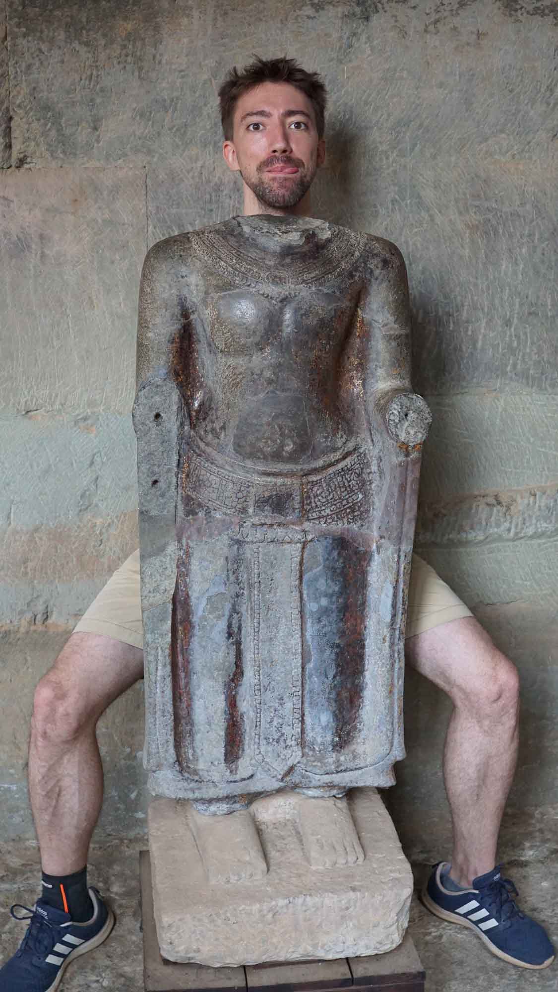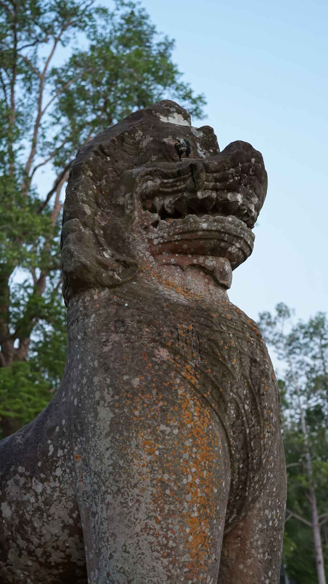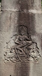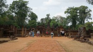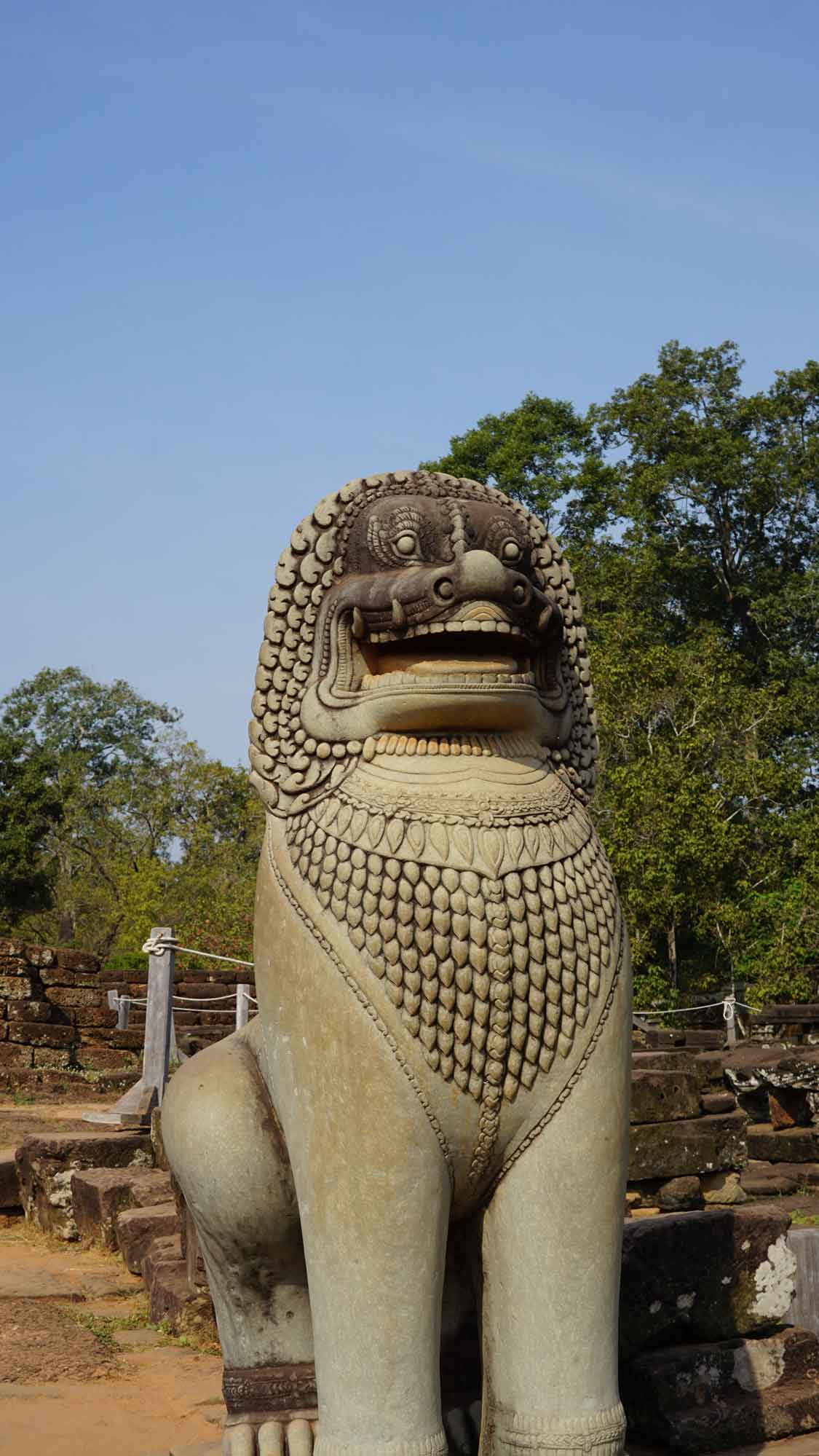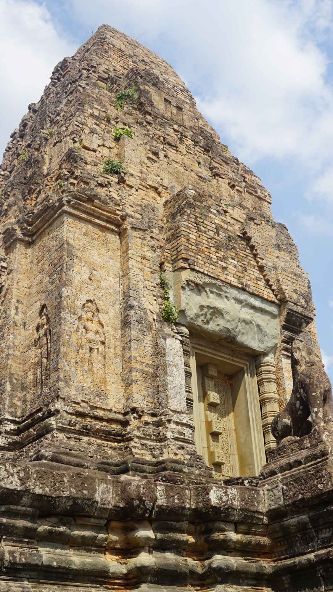 On commence par le Pre Rup puis le Mebon Oriental et ses statues d’éléphants, beaux et imposants. C’est impressionnant, mais ces deux temples sont dans la partie « sèche » du parc, donc on se liquéfie sous le soleil (épaules et genoux couverts obligatoires) et on a du mal à rester longtemps ! Ils nous donnent cependant un bon premier aperçu de l’architecture en carrés imbriqués, des très beaux bas-reliefs gravés sur les frontons des portes, et des statues qui gardent les entrées des temples. Il y a un ou deux groupes mais ça va, l’heure étant davantage au déjeuner climatisé qu’à la visite. 😅