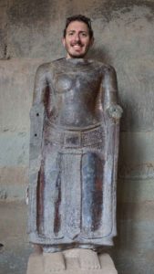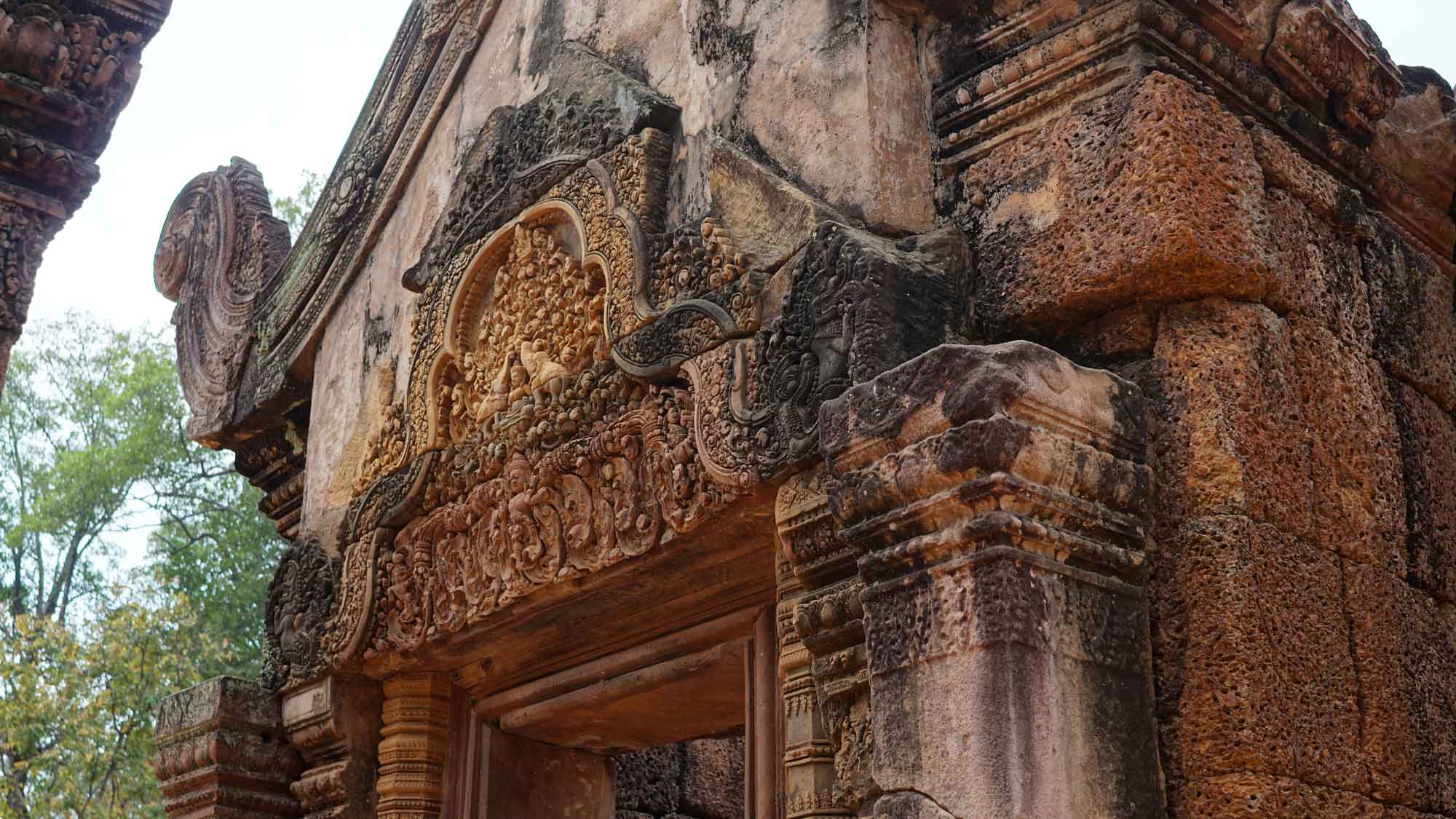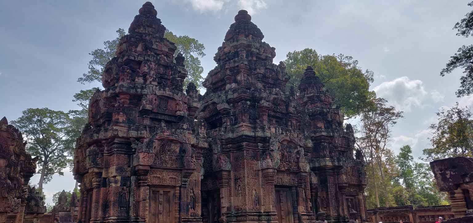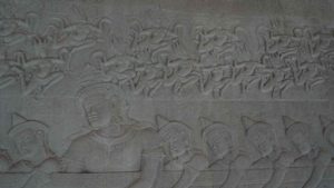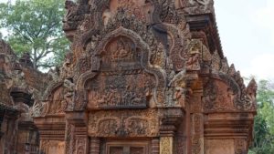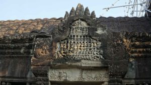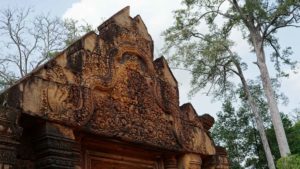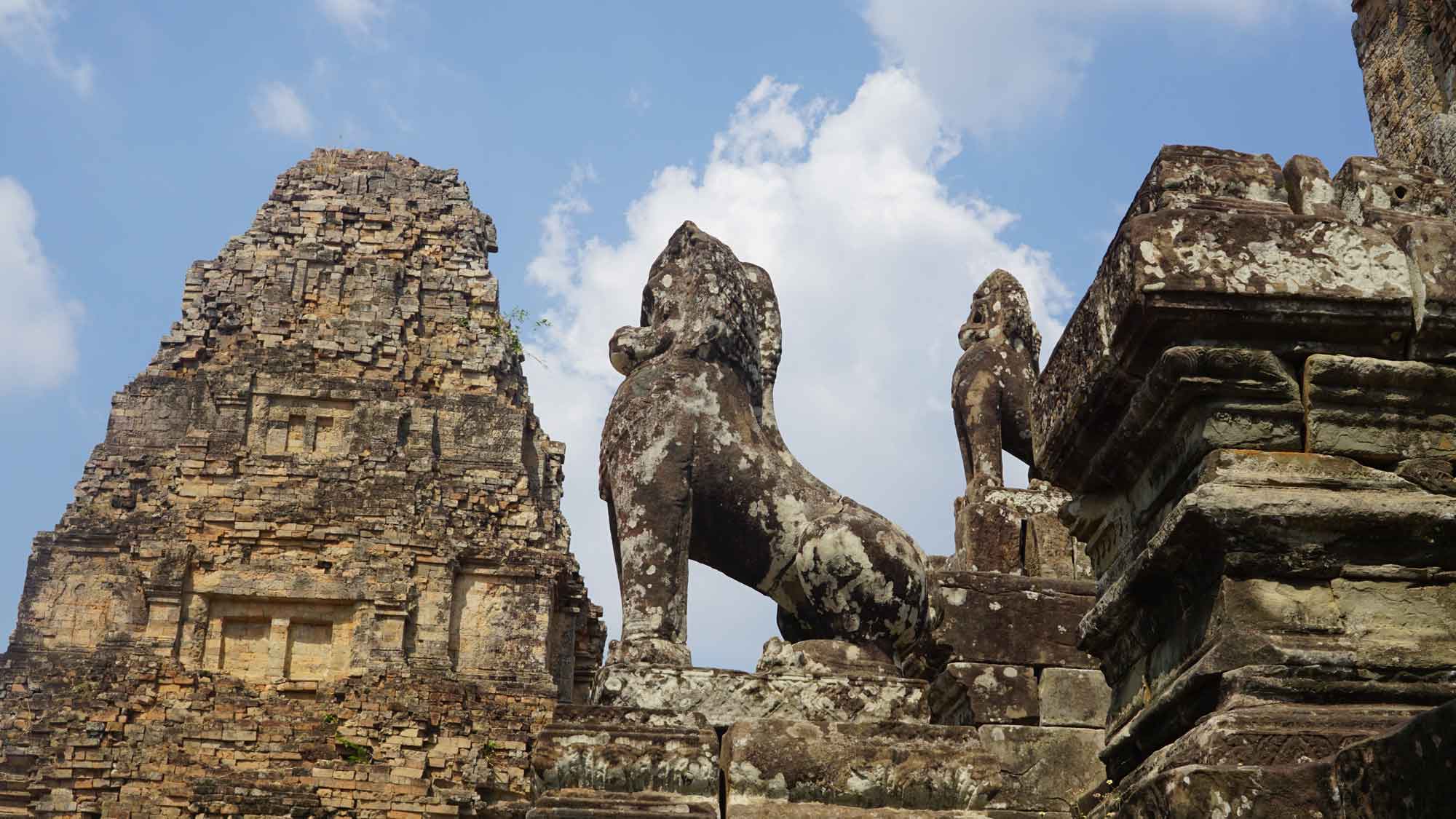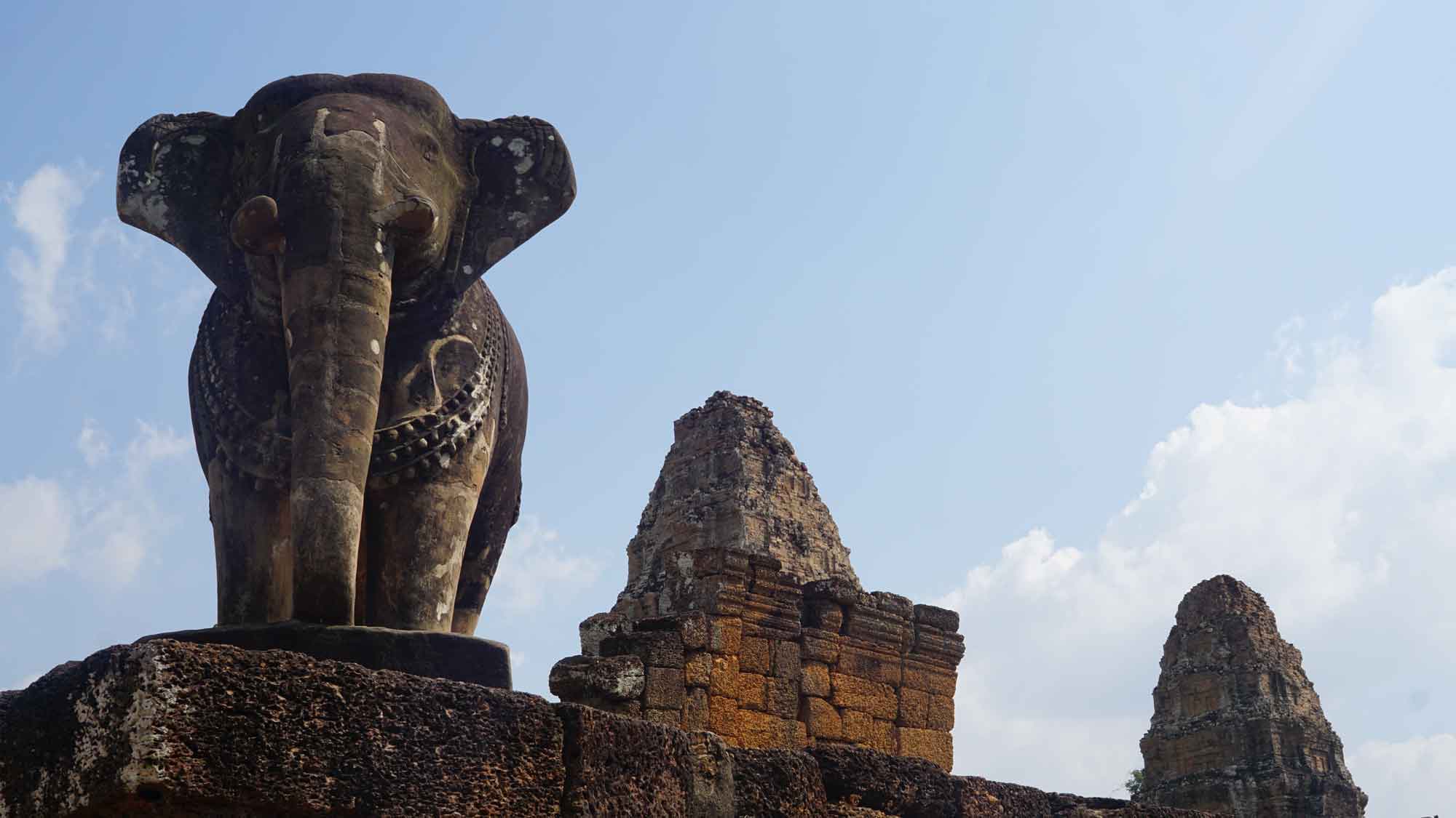 On commence par le Pre Rup puis le Mebon Oriental et ses statues d’éléphants, beaux et imposants. C’est impressionnant, mais ces deux temples sont dans la partie « sèche » du parc, donc on se liquéfie sous le soleil (épaules et genoux couverts obligatoires) et on a du mal à rester longtemps ! Ils nous donnent cependant un bon premier aperçu de l’architecture en carrés imbriqués, des très beaux bas-reliefs gravés sur les frontons des portes, et des statues qui gardent les entrées des temples. Il y a un ou deux groupes mais ça va, l’heure étant davantage au déjeuner climatisé qu’à la visite. 😅