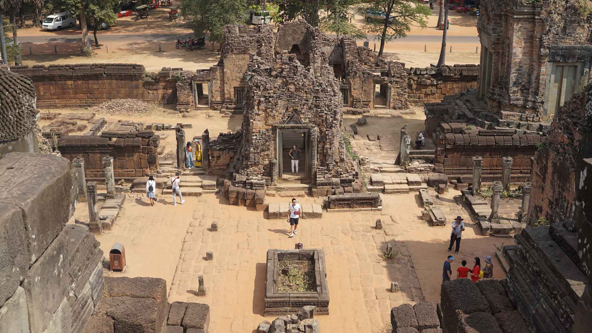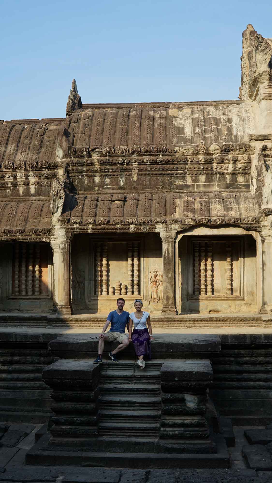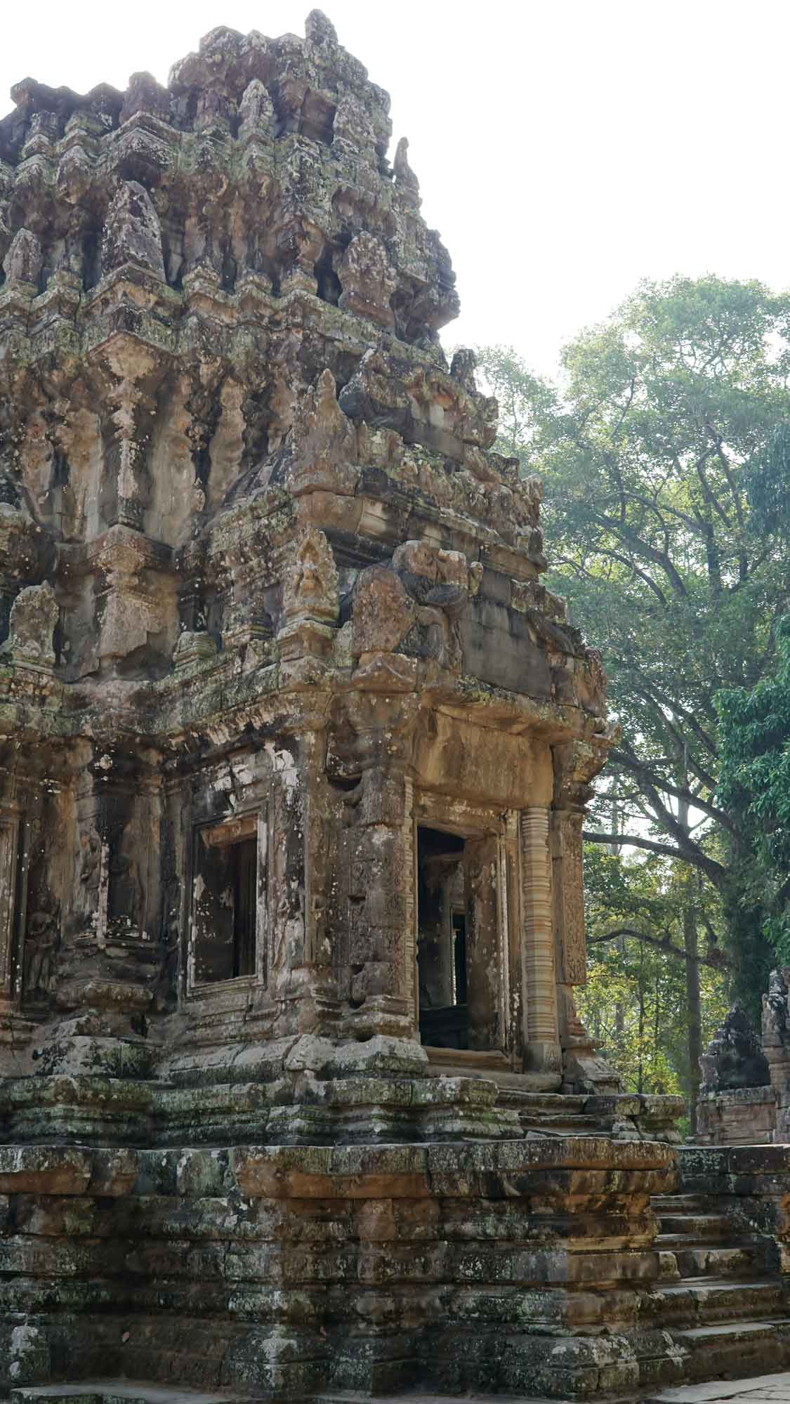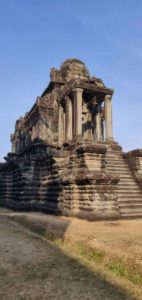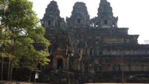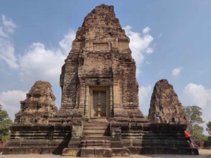 La température monte petit à petit, et les phases de tuktuk entre les temples où le vent nous rafraîchit font du bien. On passe à côté du Ta Keo ; Romain et Lexie, qui commencent à fatiguer, restent en bas tandis que Nicolas et Camille se motivent pour monter à toute blinde les escaliers. Il paraît que les marches très hautes et étroites représentent les difficultés à atteindre le nirvana… Sauf que ce que la légende ne dit pas, c’est que la descente est aussi — voire plus — dure que la montée ! On passe brièvement dans un petit temple sur la route, le Chau Sey Tevoda.