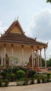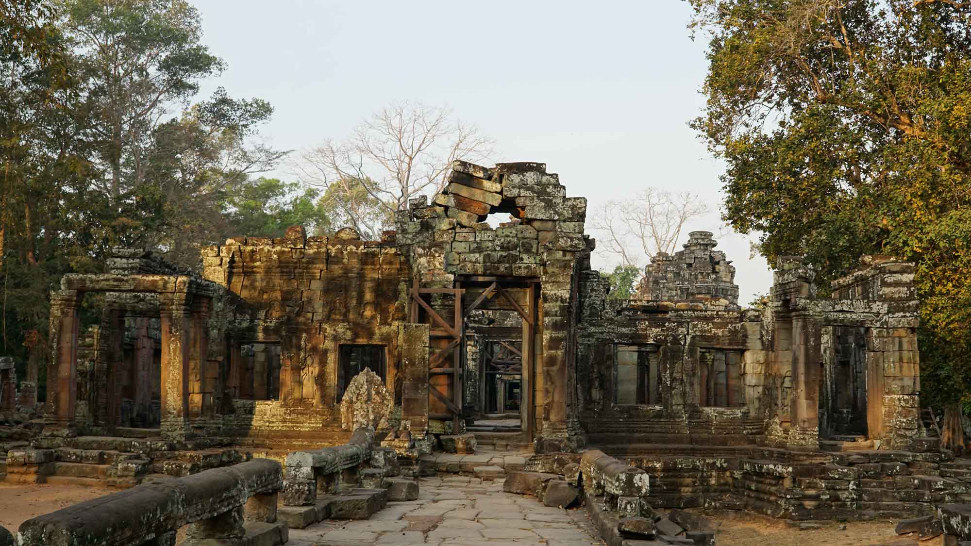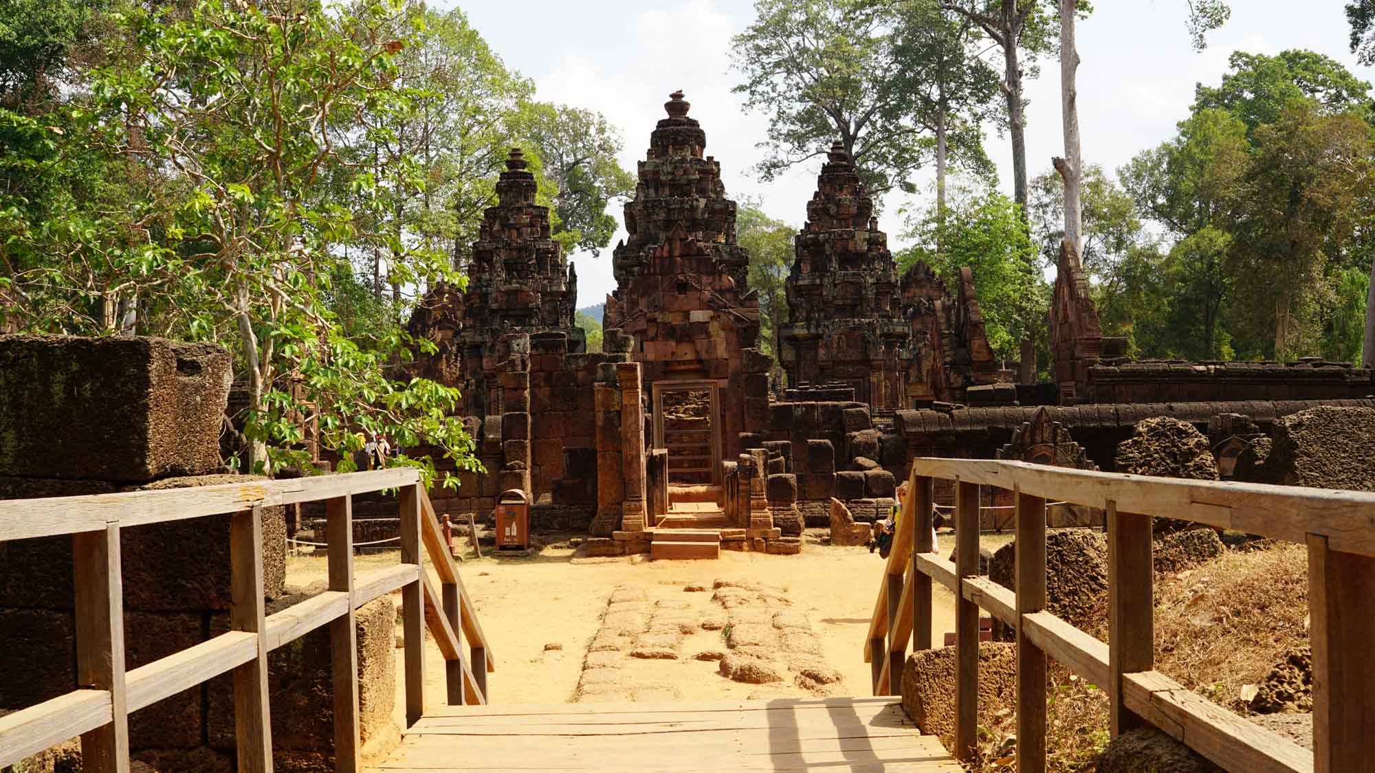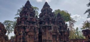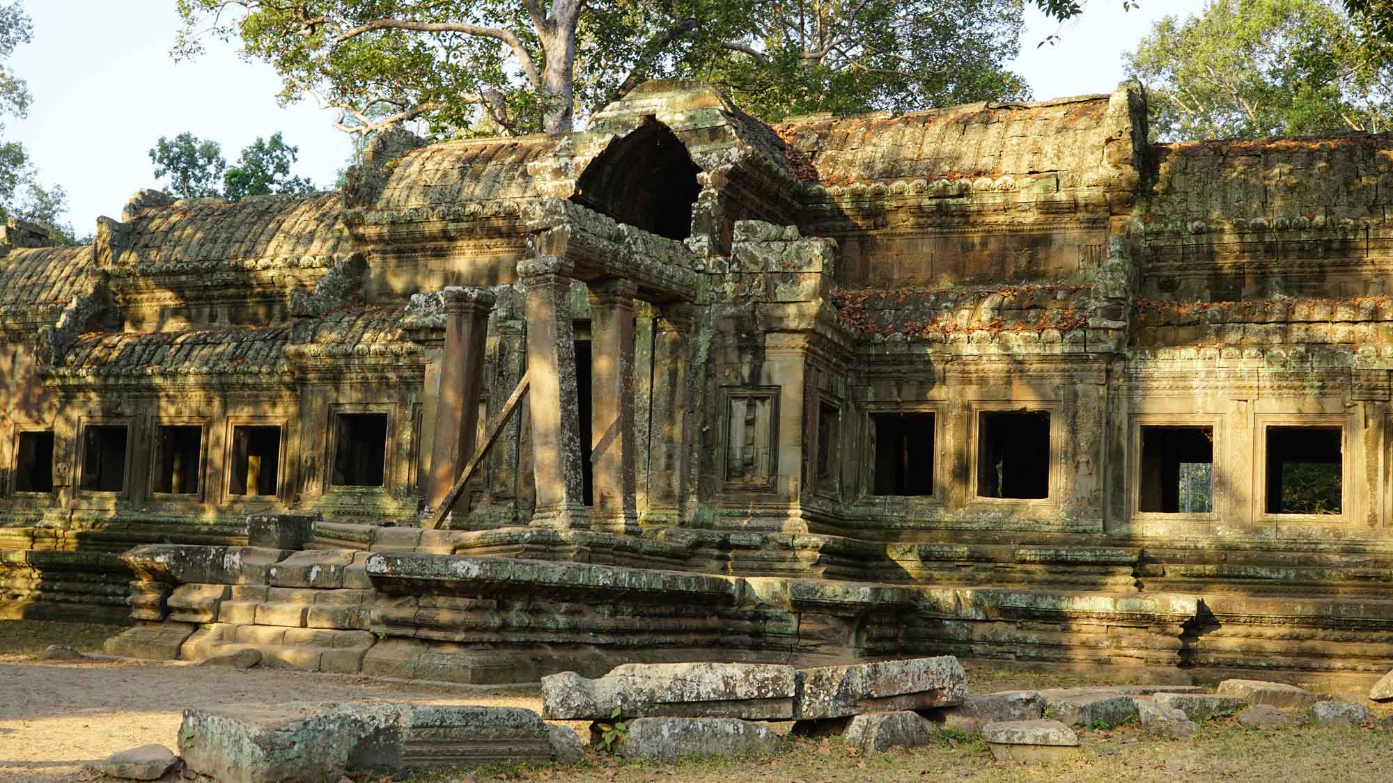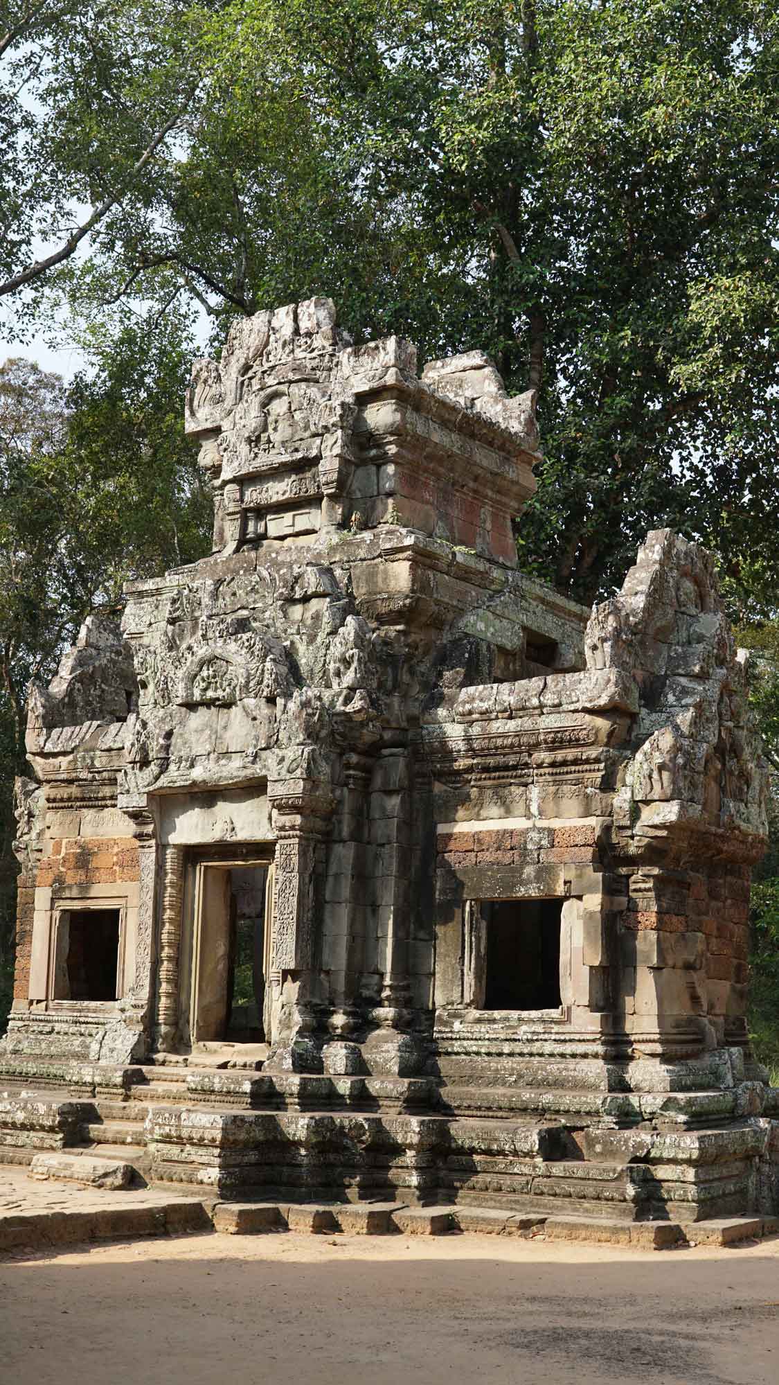 La température monte petit à petit, et les phases de tuktuk entre les temples où le vent nous rafraîchit font du bien. On passe à côté du Ta Keo ; Romain et Lexie, qui commencent à fatiguer, restent en bas tandis que Nicolas et Camille se motivent pour monter à toute blinde les escaliers. Il paraît que les marches très hautes et étroites représentent les difficultés à atteindre le nirvana… Sauf que ce que la légende ne dit pas, c’est que la descente est aussi — voire plus — dure que la montée ! On passe brièvement dans un petit temple sur la route, le Chau Sey Tevoda.