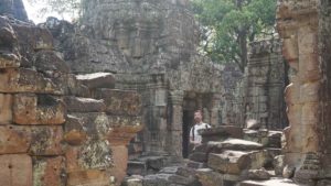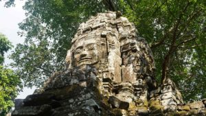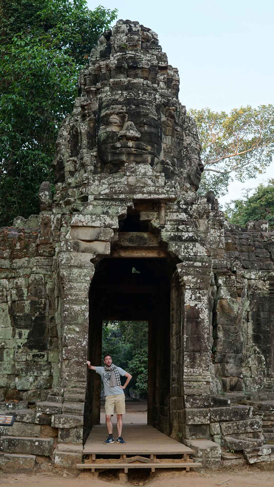Puis c’est le tour du Ta Som, qui s’enfonce davantage dans la végétation, créant une ombre bienvenue. On croise notre première porte d’entrée surmontée des quatre visages de Bouddha dos à dos, c’est très beau ! Camille, qui attend avec impatience les arbres incroyables qui ont l’air d’enfoncer leurs racines dans la pierre comme des tentacules, a son premier moment de bonheur (d’une longue série 😛) avec une porte complètement mangée par l’un de ces fameux arbres.