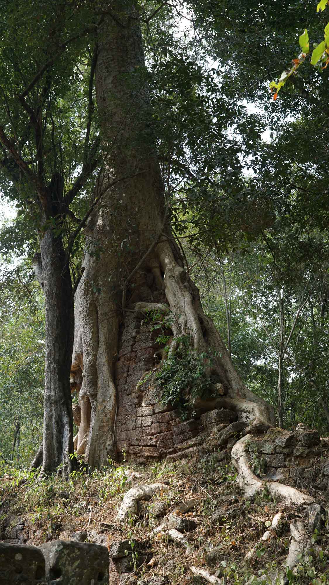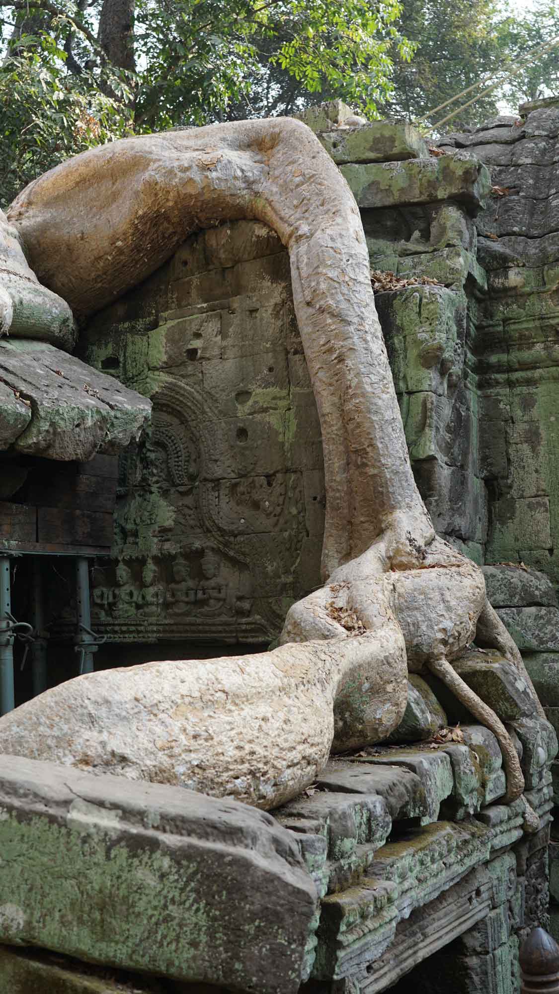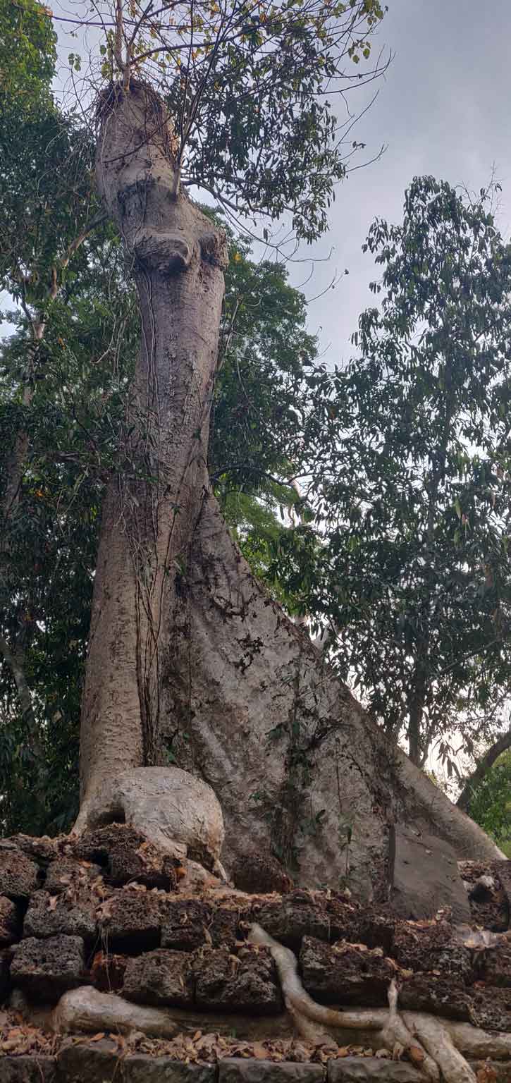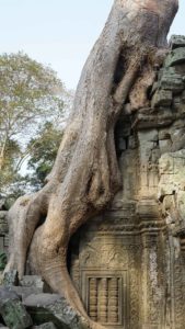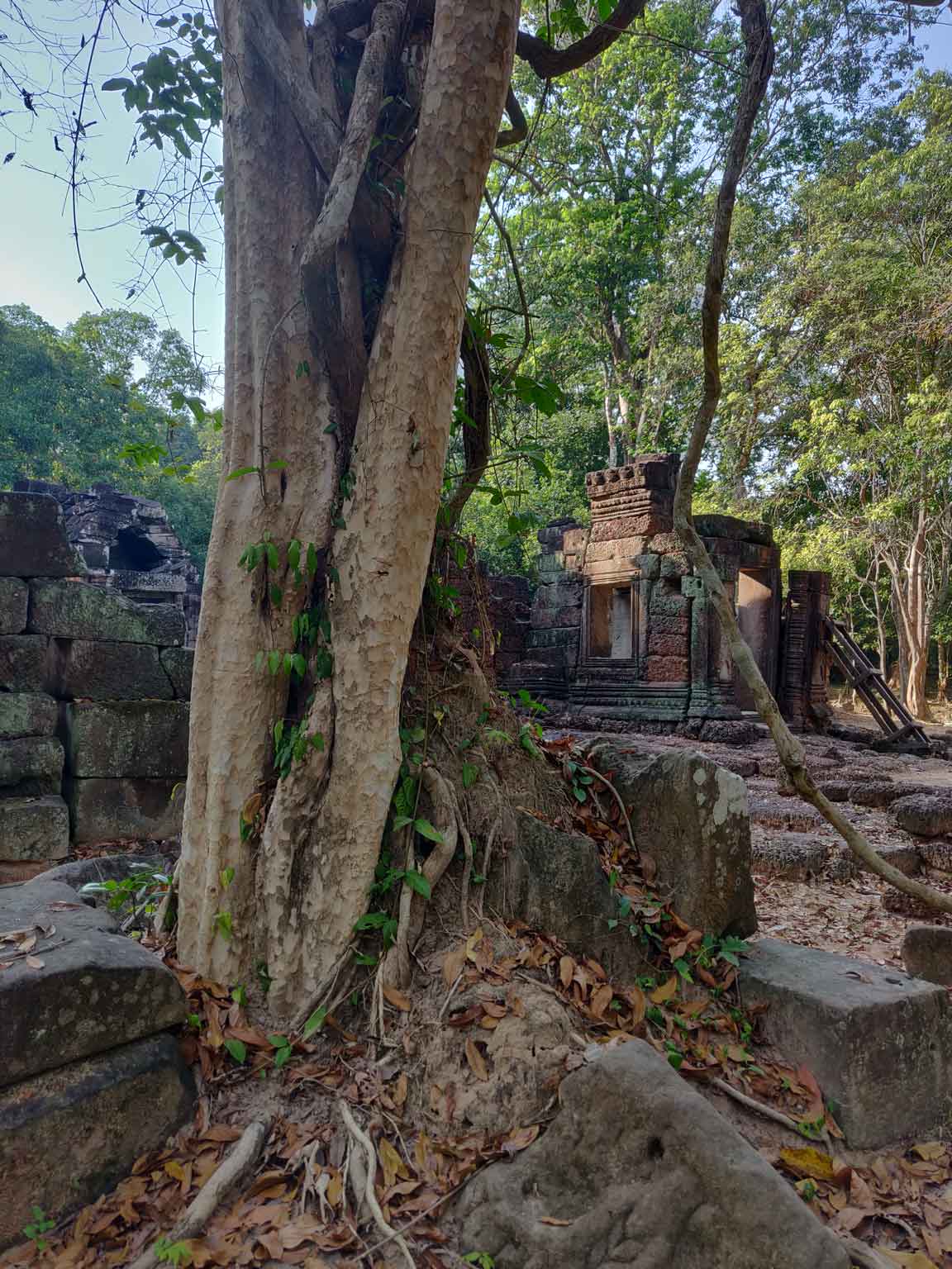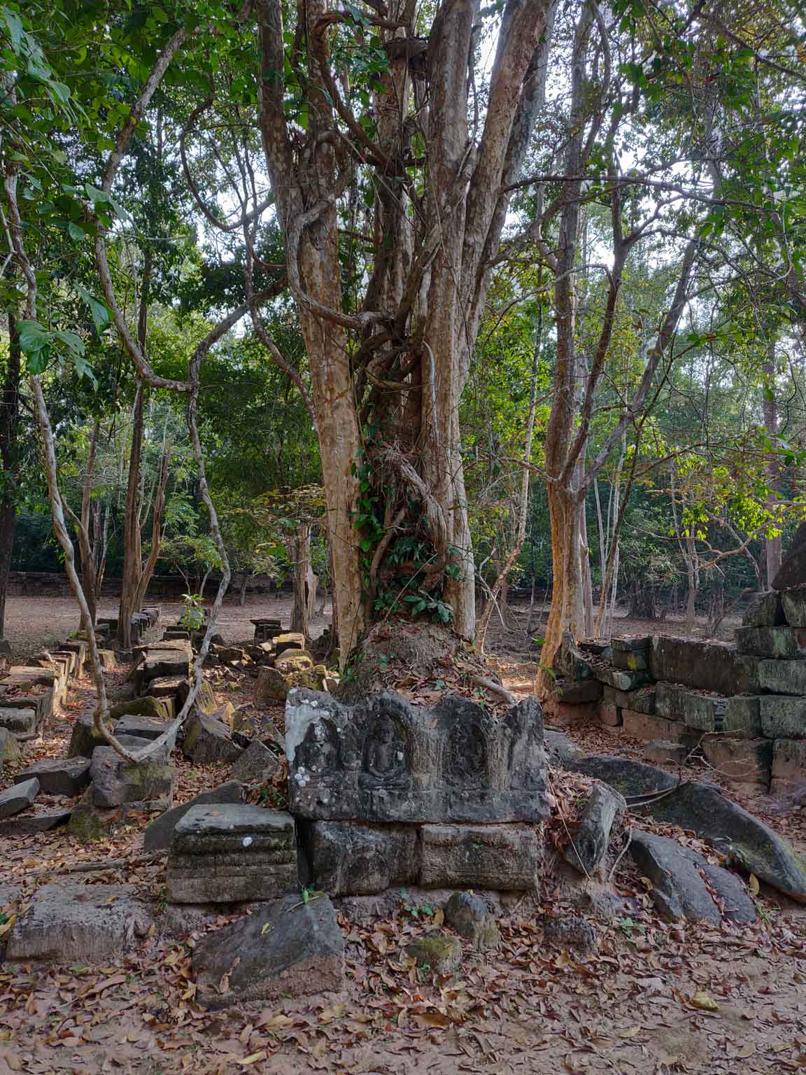 Après le repas, on se balade dans un temple moins connu un peu caché, le Krol Kô, qui recèle quelques pépites comme ce bas-relief qui semble avoir servi de terreau à cet arbre-éponge.