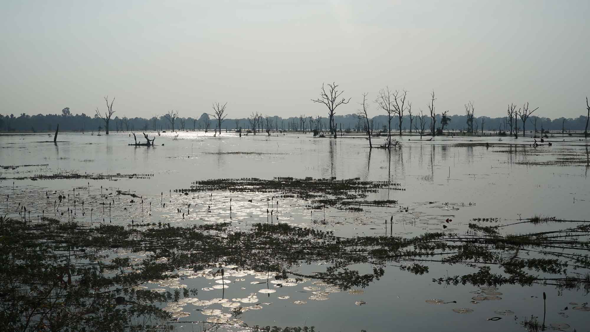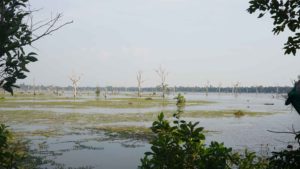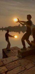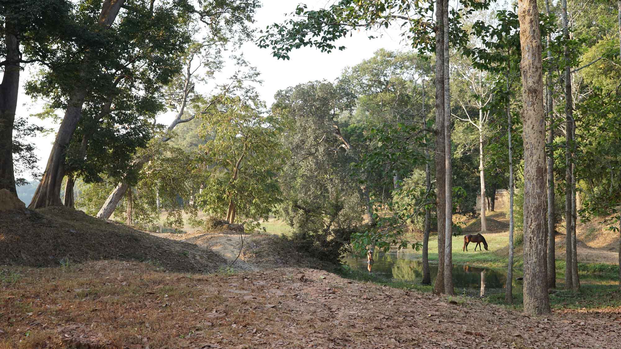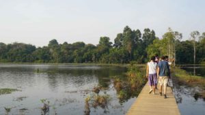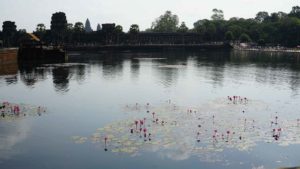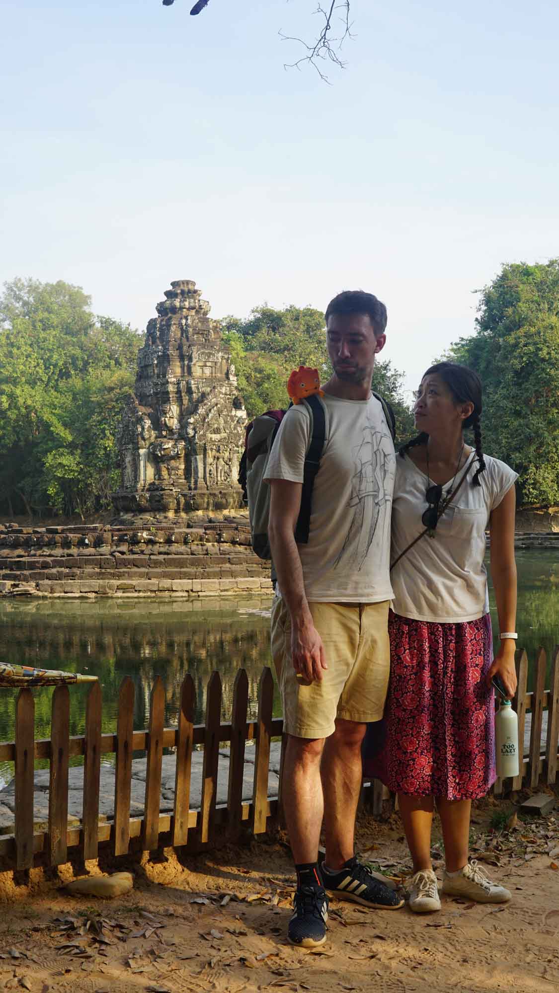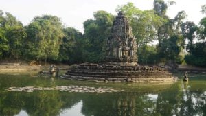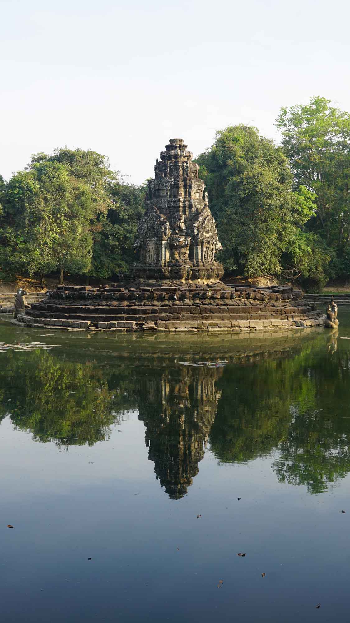 Ensuite, on emprunte un long pont en bois qui traverse une immense étendue d’eau, magnifique avec ses silhouettes d’arbres qui sortent au hasard de l’eau. On dirait qu’ils se sont perdus, ou qu’ils montent la garde… Au bout se trouve l’île centrale, où on admire le Neak Pean, un de nos temples préférés ! Au centre d’un carré d’eau, il s’y reflète en symétrie parfaite, c’est magnifique. L’occasion entre autres d’une petite sortie pour Calcifer. 🥰