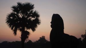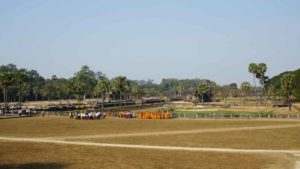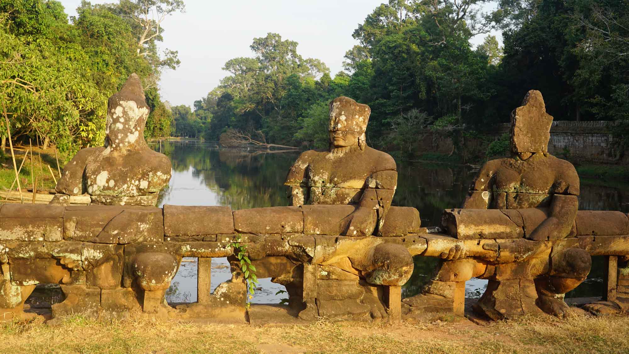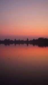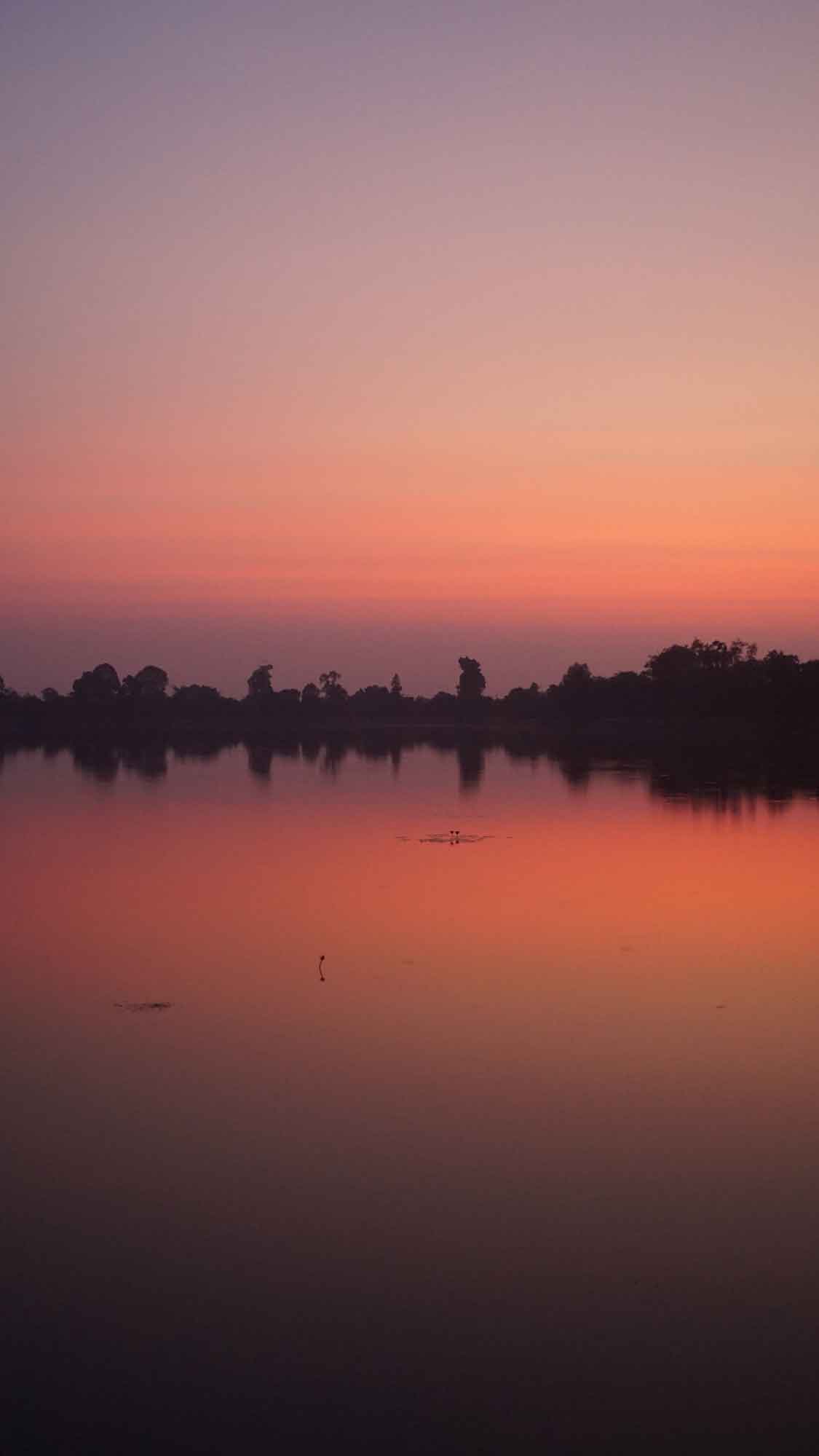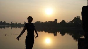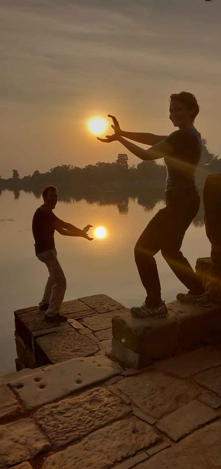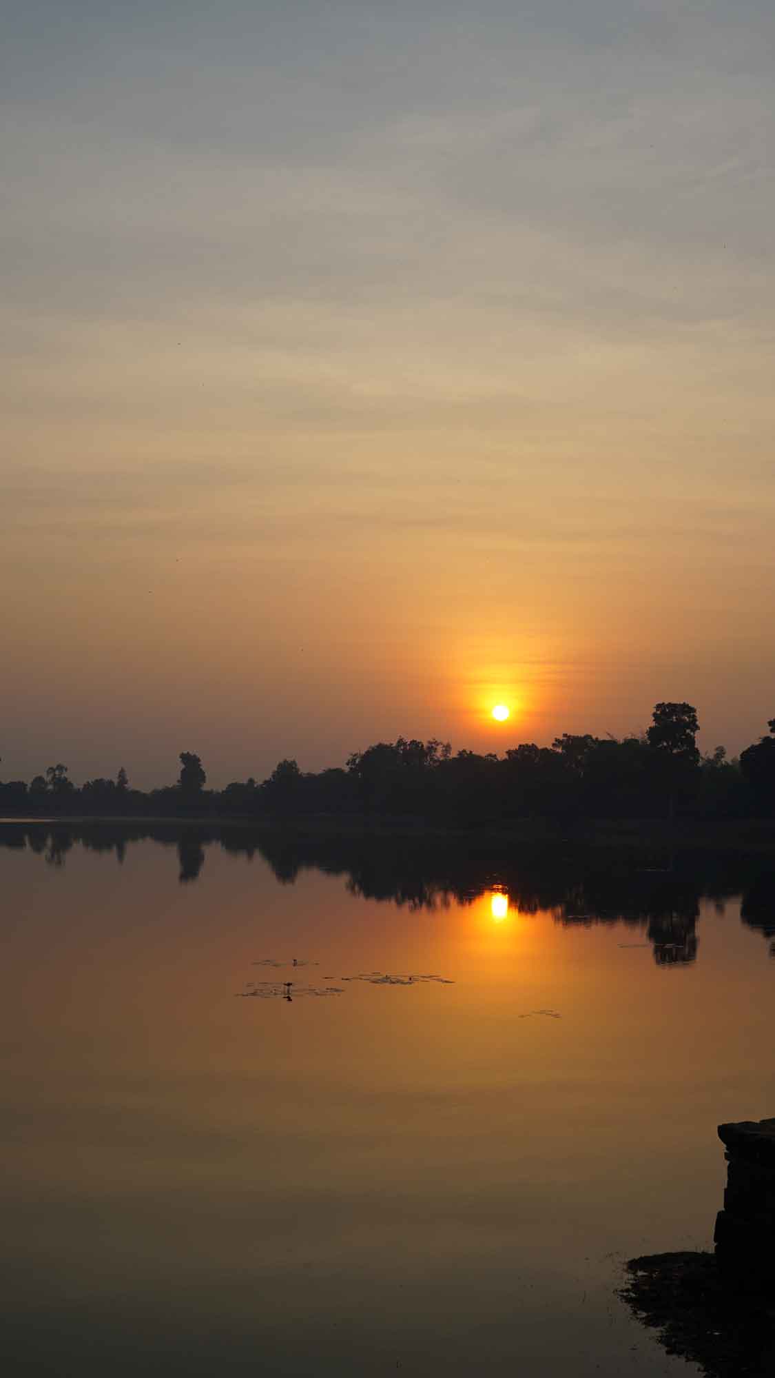 On arrive très tôt au promontoire de Sra Srang, temple en ruine au bord d’un lac artificiel qui sert d’esplanade pour attendre le lever du soleil. Il est 5h30, le ciel est noir et on voit encore les étoiles… Puis peu à peu, l’horizon rosit. Il y a un peu de monde, on doit être une vingtaine, mais apparemment ce n’est rien comparé à la foule qui se masse aux deux autres points de vue potentiels, Angkor Wat et Angkor Thom (les seuls qui ouvrent à 5h30). L’arc-en-ciel en étages s’ allume, du bleu de plus en plus clair du ciel jusqu’à l’incarnat de la ligne d’horizon, en passant par le jaune et l’orangé. Il y a des nuages, et on pert patience, croyant que le soleil est déjà levé mais qu’ils le cachent… mais non ! Alors que pas mal de gens sont déjà partis, un peu déçus, le disque rouge feu décolle lentement, tandis que son reflet s’enfonce d’autant dans l’eau. Tant mieux pour nous, qui en profitons un maximum maintenant qu’on est presque tout seuls ! Nicolas, qui a voulu faire un time lapse avec son téléphone et s’est presque attrapé une crampe au bras, est soulagé de ne pas l’avoir fait pour rien. 😝