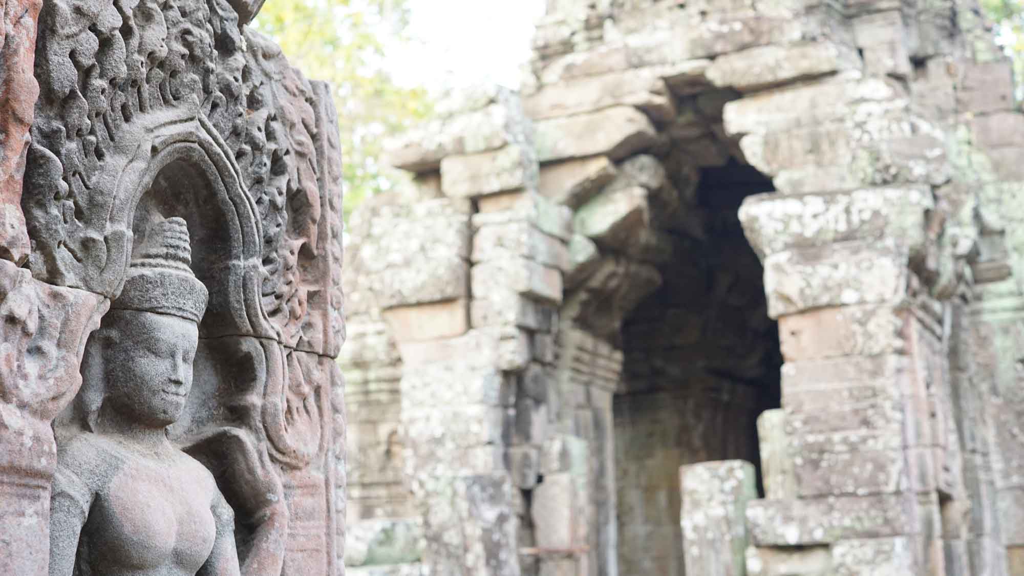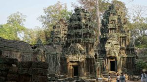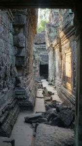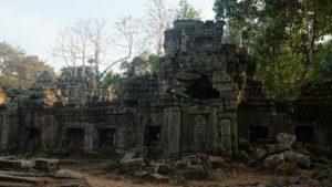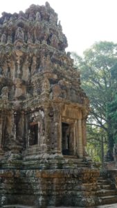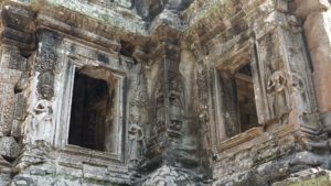 Après avoir petit-déjeuné en attendant 7h30 que les autres temples ouvrent, nous commençons par le Bandteai Kdei. C’est un des temples qui ne sont que sur un étage, contrairement à d’autres construits comme des pyramides qu’on peut escalader. Il est au milieu des arbres, et il n’y a personne à part nous (même les vendeurs devant le temple ne sont pas encore arrivés)… C’est fabuleux, on en profite ! Les gravures, les portes à demi effondrées, les statues sans visage…