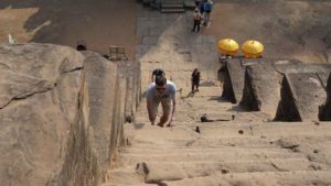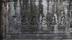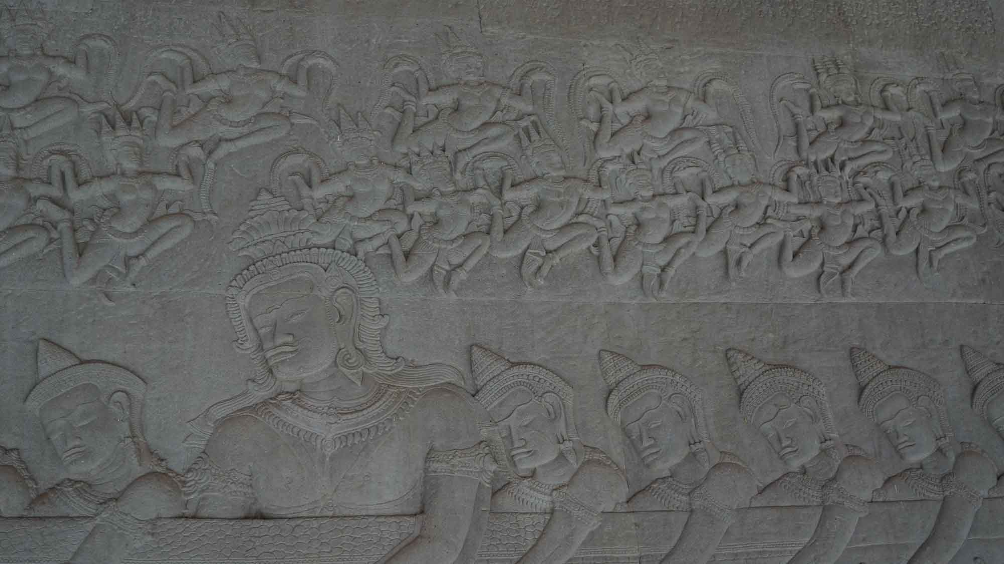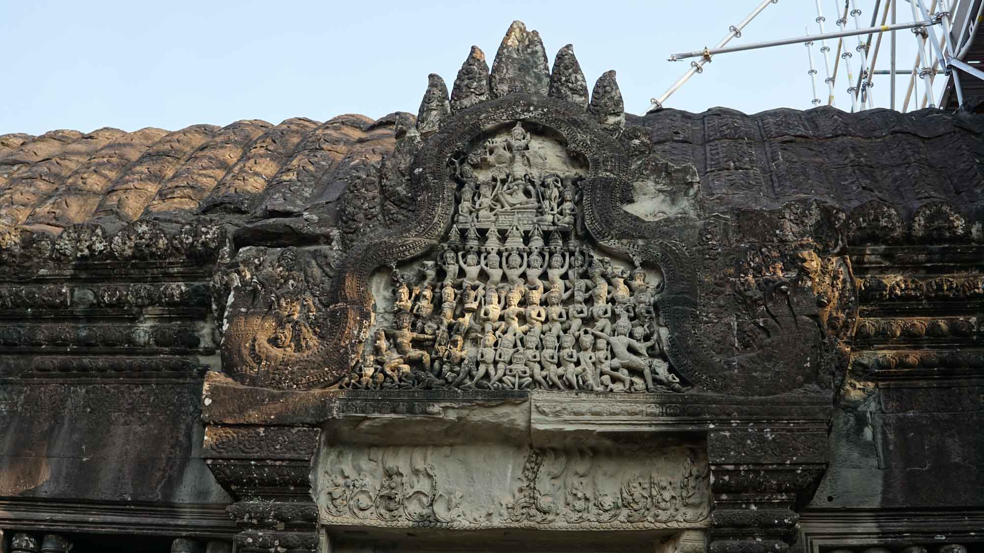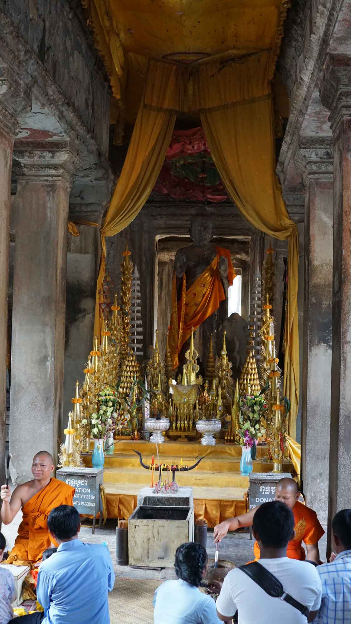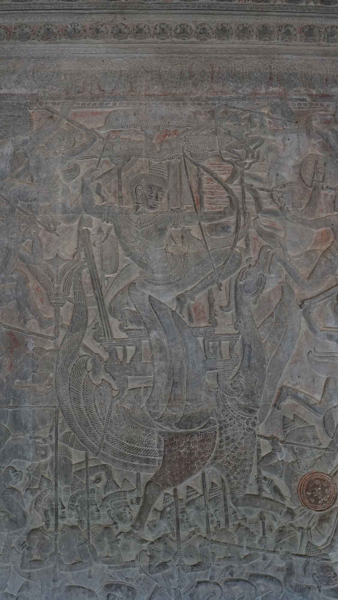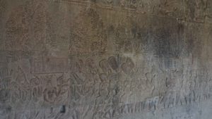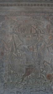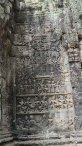 Là en revanche c’est très beau : des quatre côtés on voit des bas reliefs immenses et magnifiques, qui représentent sur deux faces des batailles, sur l’une l’enfer, et l’autre la demeure des dieux. C’est très détaillé et bien conservé, c’est le bonheur 😁. Devant, il y aussi une zone différente où des groupes viennent prier et deux moines psalmodient, et une sorte de petit temple supplémentaire où Camille et Nicolas montent histoire de voir ce qui s’y cache (spoiler : une ruine de bouddha).