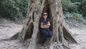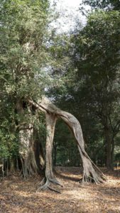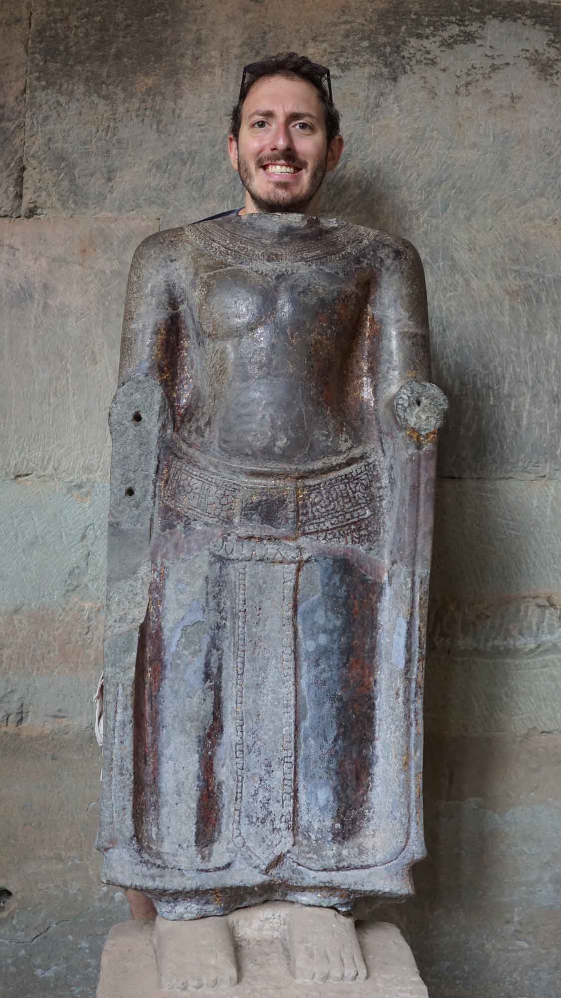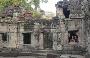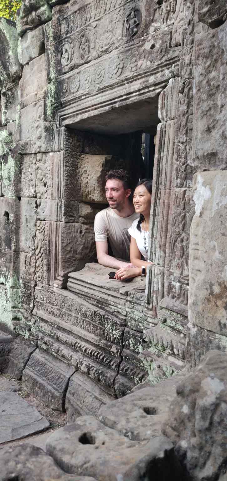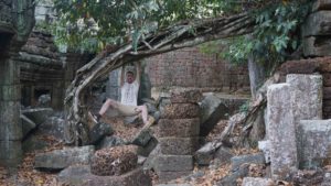 Enfin, on termine la journée avec le Prea Khan, au Nord-Ouest. On ne sait pas si c’est grâce à la fermeture imminente du site (il était 17h10 quand on y est rentrés, et tous les temples ferment à 17h30), mais on y était presque seuls, et ça change tout. Soudain, l’atmosphère devient incroyable, on se perd dans le temps, on a l’impression d’explorateurs de la fin du monde. Camille traîne à partir car elle repère un arbre au tronc absurde qui forme comme un immense rideau qui part en diagonale, indépendant du reste du tronc. Nicolas se fait mal à la cheville en faisant l’andouille pour une photo, mais au final plus de peur que de mal (tu nous donneras des nouvelles Nicolas !).