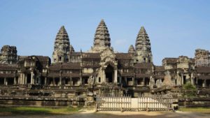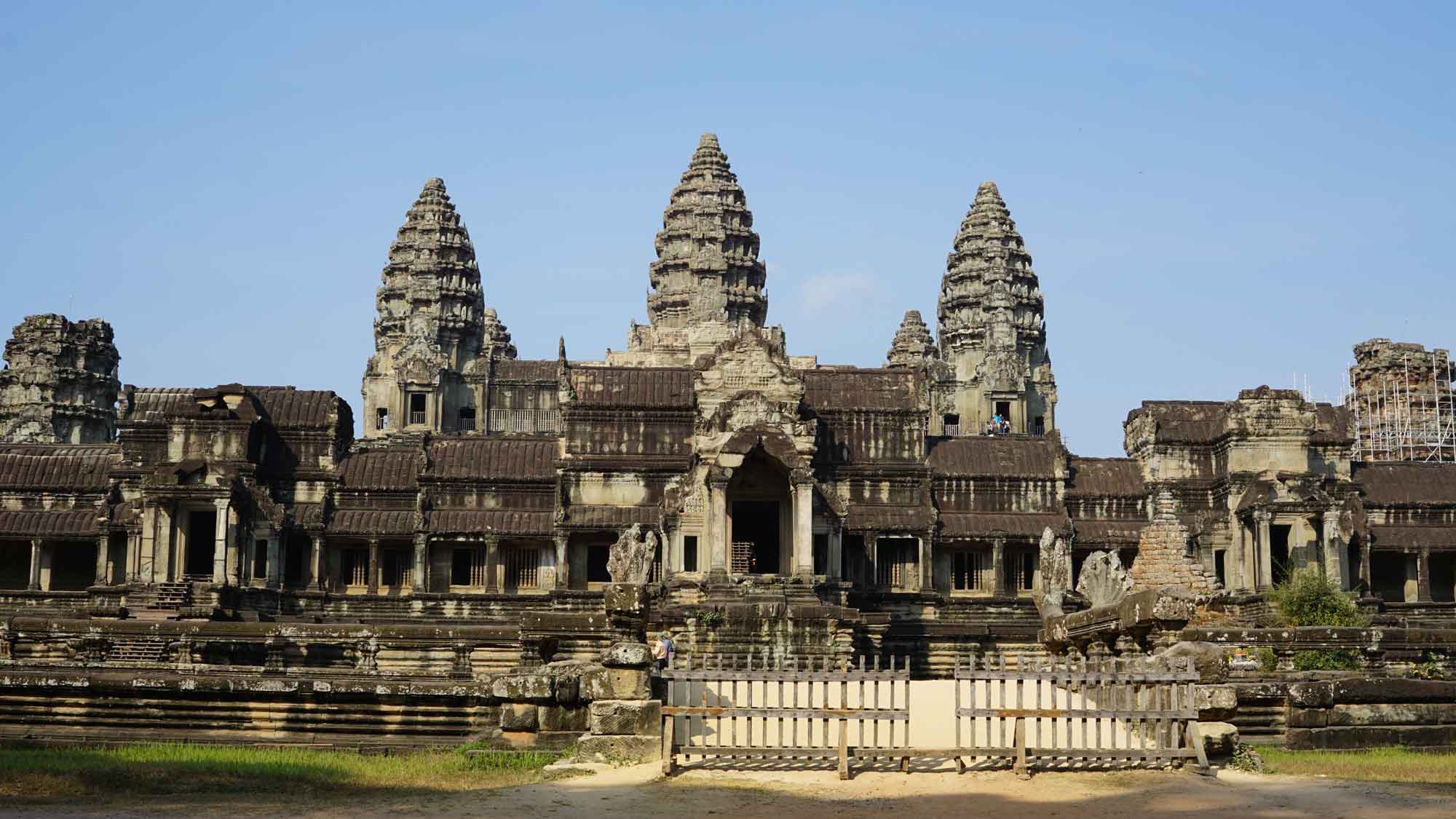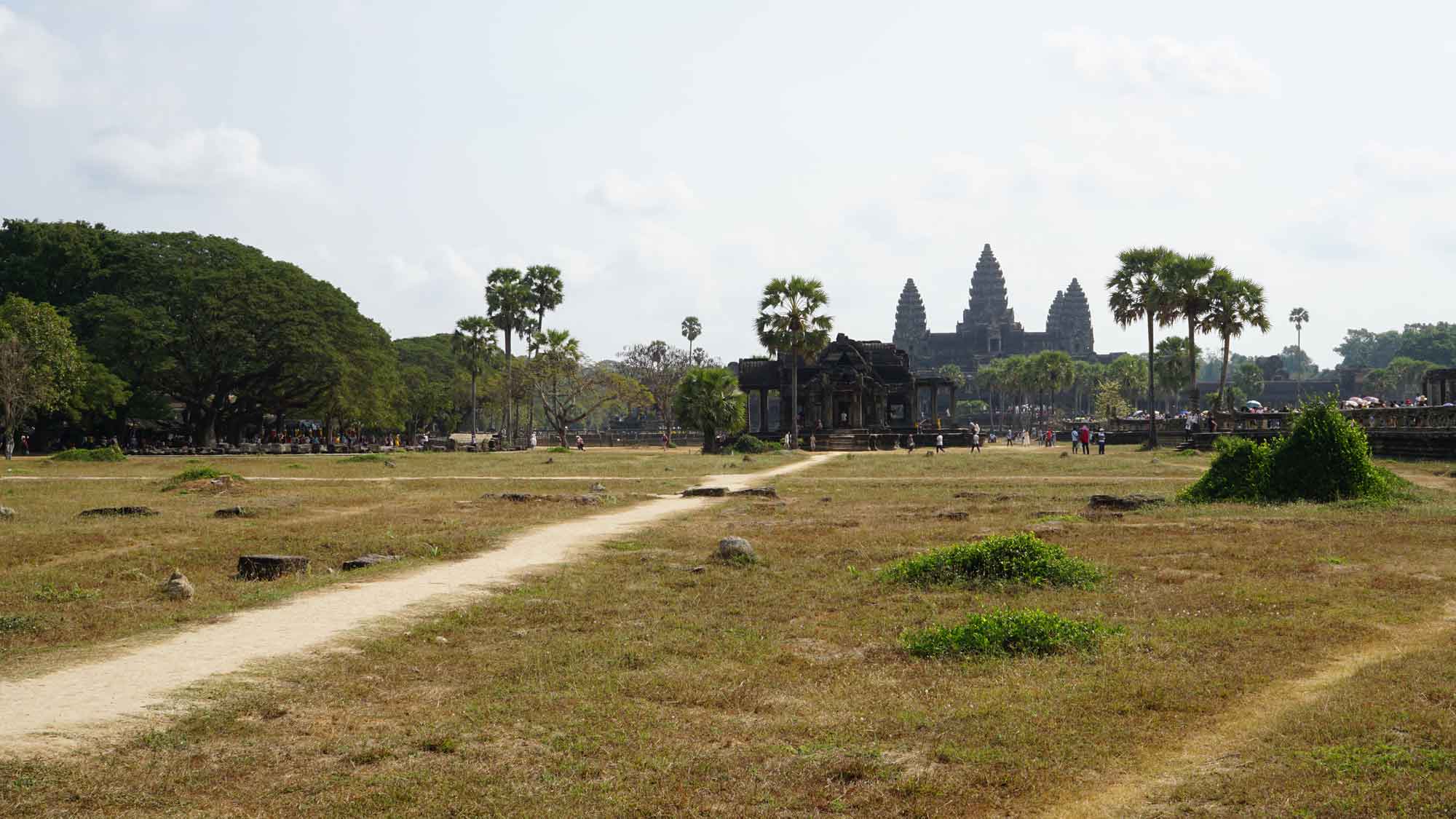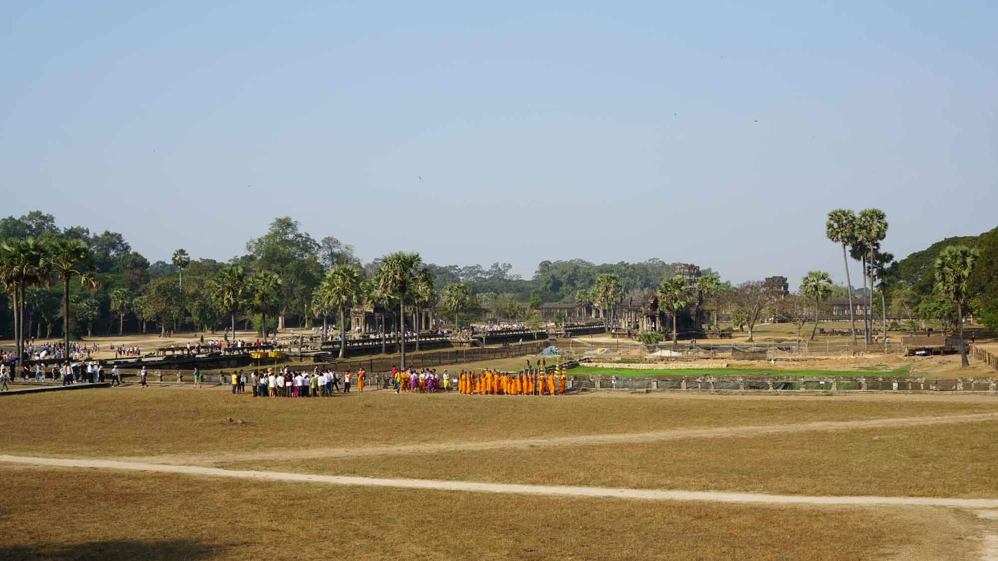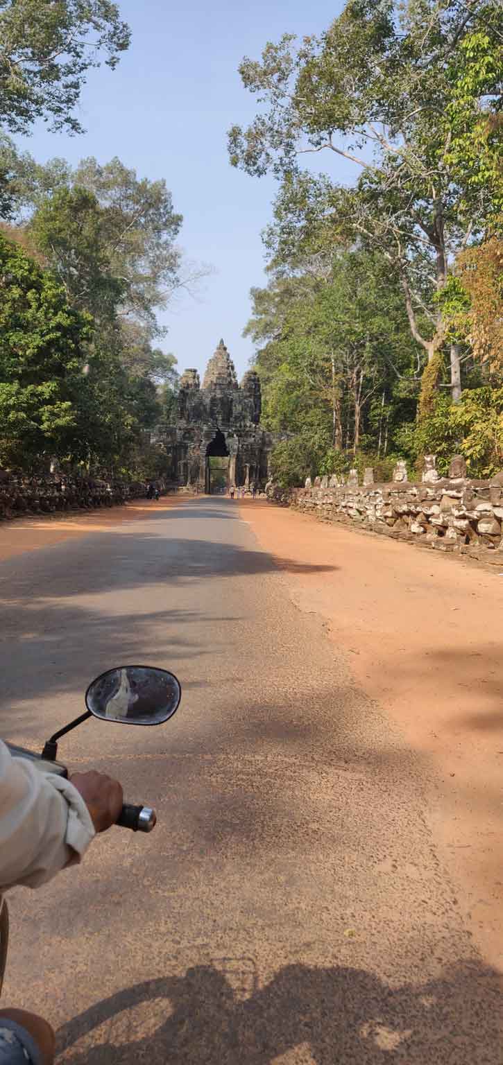 Puis on débouche sur le côté traditionnel de l’entrée, et là on aperçoit l’immense espace dégagé devant le temple où le soleil tape (et il est pourtant tôt…). On rebrousse chemin pour reprendre les scooters et faire le tour, et on va observer le temple depuis l’autre entrée, après un passage sur un pont en plastique semi-rigide qui donne l’impression de rebondir quand on marche 😆. C’est un passage express (on meurt de chaud) mais ça vaut le coup.