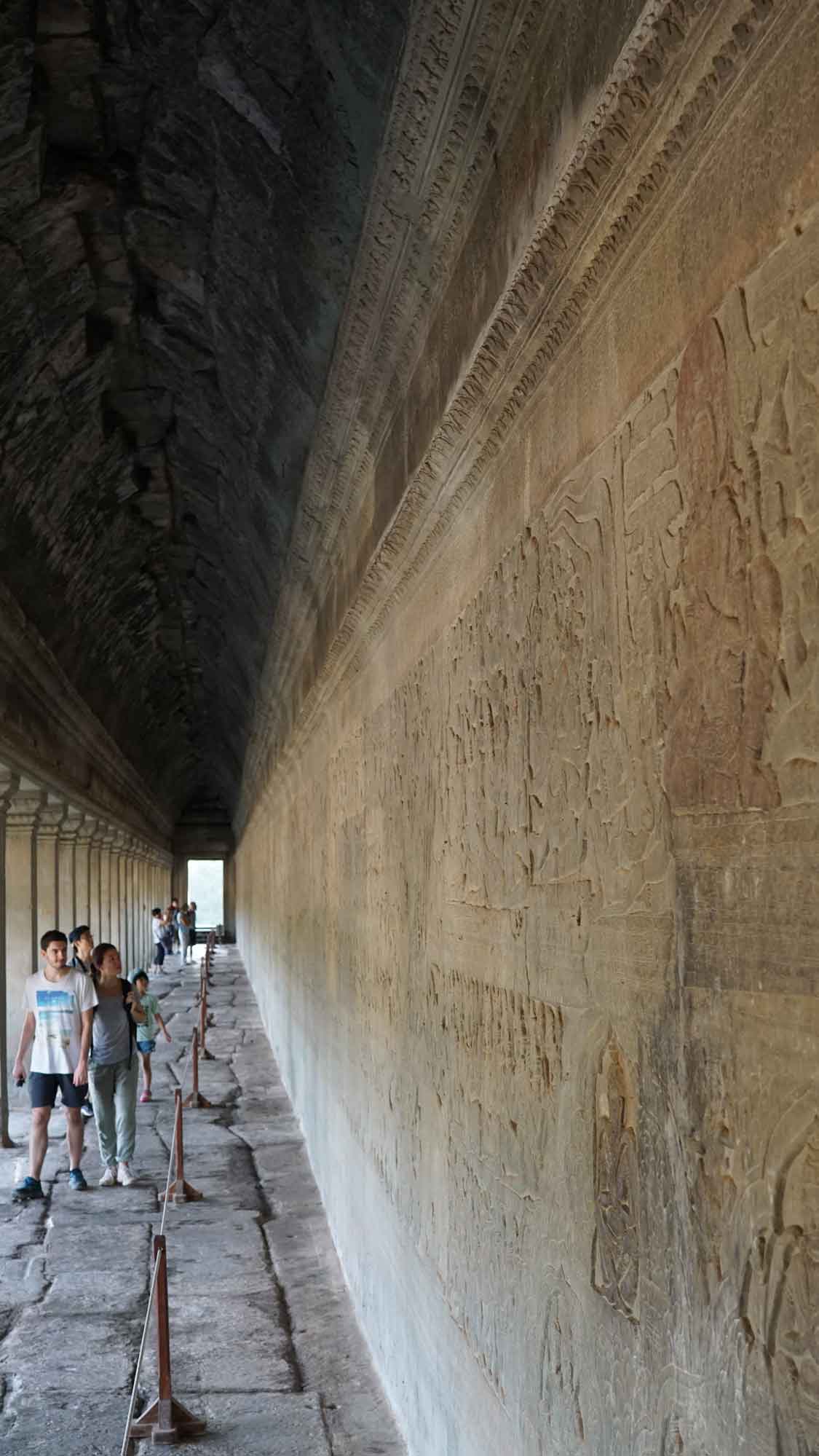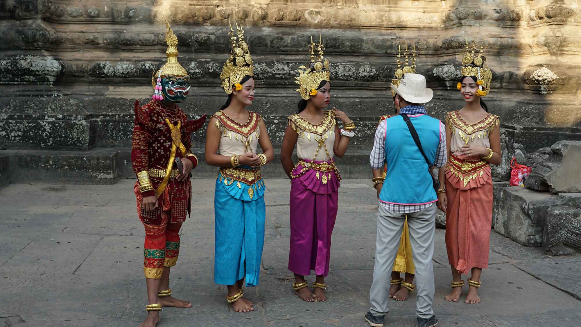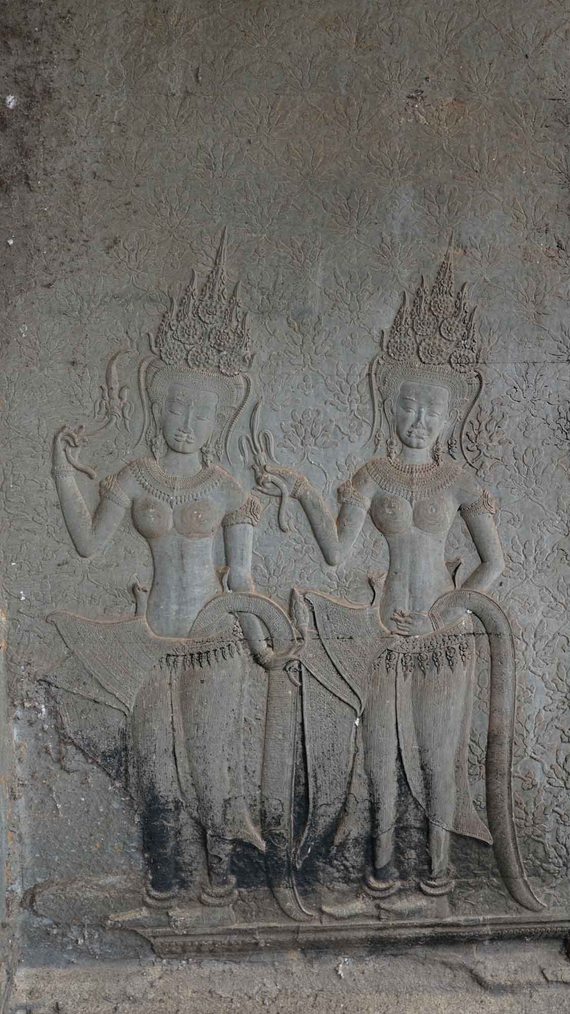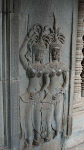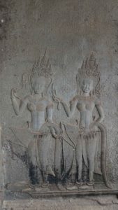 Départ 7h en scooter pour aller faire LE temple d’Angkor, Angkor Wat. On se gare du côté opposé à l’entrée principale, ce qui fait qu’on voit le temple arriver petit à petit en se rapprochant, sans trop de monde. Il est effectivement très impressionnant ! Une fois à l’intérieur en revanche, on déchante un peu : c’est bondé. Il y a une queue interminable pour avoir le droit de monter les escaliers qui mènent au niveau suivant, donc on laisse tomber, et de manière générale, on n’est pas fan de l’ambiance : quatre danseuses en costume traditionnel qui n’ont pas l’air très heureuses d’être là prennent la pose, et un homme annonce aux visiteurs qu’il faut payer pour avoir le droit de les prendre en photo. Bref c’est un peu la foire, et on préfère faire le tour par les couloirs extérieurs.