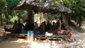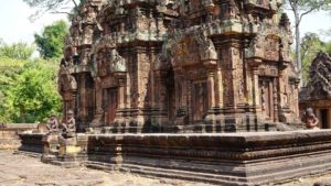 Ensuite, on sort de la zone classique des temples pour aller voir le Bandteai Srei, bien plus loin à 30 km (45 min de scooter quand même !). On tressaute un peu sur le scooter mais on arrive entiers au temple. L’entrée fait un peu usine à tourisme avec les restaurants, boutiques, parkings, etc… mais le temple, bien que plus petit que certains qu’on a visités, est superbe car très bien conservé. Gravures, statues de singes gardiens, architecture… C’est beau ! De l’autre côté, un groupe de musiciens traditionnels joue ; comme à côté de nombreux autres temples d’Angkor dont le Neak Pean du premier jour, il s’agit de mutilés par les mines anti-personnel qui couvrent le territoire. On leur achète un album, ce qui ne doit pas arriver souvent, et ils ont l’air ravis. 🙂