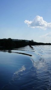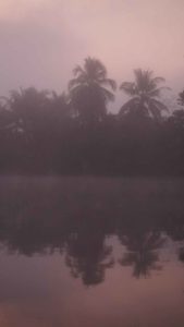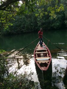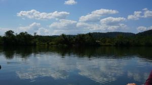 Première étape de la journée : le bateau ! D’abord à moteur pendant une heure et demi, pour rejoindre un bras du fleuve qui part vers le nord. Le jour se lève petit à petit, et on se régale de notre petit-déjeuner, c’est très sympa même si le moteur est un peu bruyant et qu’il fait frais 😉. Ensuite, on change d’embarcation et embarque dans une petite pirogue où un autre guide, debout, pagaie pour faire moins de bruit. C’est parti pour le « birdwatching », observation des oiseaux et autres animaux… Rien n’est jamais garanti, mais on a eu beaucoup de chance et notre conducteur était top : très attentif, il s’arrêtait ou revenait en arrière et nous pointait du doigt dès qu’il répétait quelque chose. On a ainsi pu voir de nombreux singes qui sautaient d’arbre en arbre, des calaos qu’on était bien contents de retrouver après Ko Chang 😀, pleins d’autres petits oiseaux et un énorme Toucan, aux ailes tellement larges qu’elles font un sacré bruit quand il vole ! Ravis, on se fait déposer par la pirogue au point de rendez-vous où nous rejoignent Kim et Sowann, qui étaient restés sur le bateau à moteur.