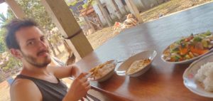 Le midi, pause dans le cours d’une rivière presque à sec, où ils s’installent pour faire un feu et prendre de l’eau. Kim s’esclaffe : « Restaurant Cambodia! » avec son éternel rire contagieux 🙂. Il nous explique qu’en plus d’avoir oublié ses lunettes ce matin, ils ont oublié le savon. On comprend alors que l’eau qui sert à nettoyer les plats, ET à faire la cuisine… c’est l’eau stagnante et franchement suspecte des petites mares, seuls restes de la rivière pendant la saison sèche. Gloups 😩. On décide de faire au moins une petite opération « séchage des assiettes », Andy s’avance bravement, en clamant fièrement que sa mission sera de les essuyer et, tout aussi bravement, glisse sur la pierre et se retrouve dans l’eau, les pieds trempés, son rouleau de papier toilette complètement imbibé 😂. Heureusement il ne s’ est pas fait mal. Romain, fidèle à lui-même, se fera un devoir de le taquiner non stop à ce sujet les trente-six heures suivantes 😆. Au final, on n’aura même pas été malades, comme quoi l’eau bouillie est à la hauteur de sa réputation ! Pendant que la cuisine se fait, Camille en profite pour tourner une autre vidéo pour sa chaîne YouTube de chansons du monde. Le repas est très bon, riz blanc avec légumes frais sautés (carottes, morning glory, courgette…) et poulet, puis on reprend la route !