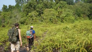 Sowann et lui nous montrent les différentes variétés d’arbres, nous font boire l’eau d’une liane, nous expliquent comment la sève du « coki », qu’une flamme ramollit, sert à isoler la coque des bateaux, et dégagent parfois le chemin à coup de machette (bien affûtée, ça rigole pas). Ils nous confectionnent en deux temps trois mouvements des bâtons de marche qu’on sera bien contents d’avoir tout au long du chemin, et qui seront l’occasion de bien rire de Camille qui oublie systématiquement le sien à chaque pause… 😅