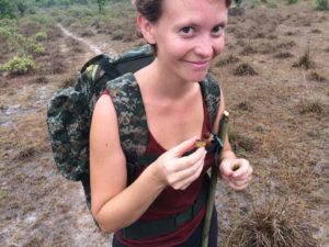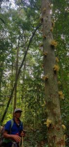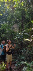 On papote de tout et de rien avec Andy, on aperçoit presque les gibbons et on revoit l’immense Toucan qui passe au-dessus des arbres deux fois (« lucky, lucky! » nous dit Kim). À 16h, on arrive au campement (« Hotel Cambodia! Hahaha! » 😊) où on s’installe pour la nuit : un plancher surélevé, un toit pour protéger de la pluie, et de quoi accrocher nos hamacs 🙂. On se souviendra longtemps de la petite sieste qu’on s’accorde à ce moment-là, bercés par le balancement du hamac et les chants d’ oiseau. On est bien…