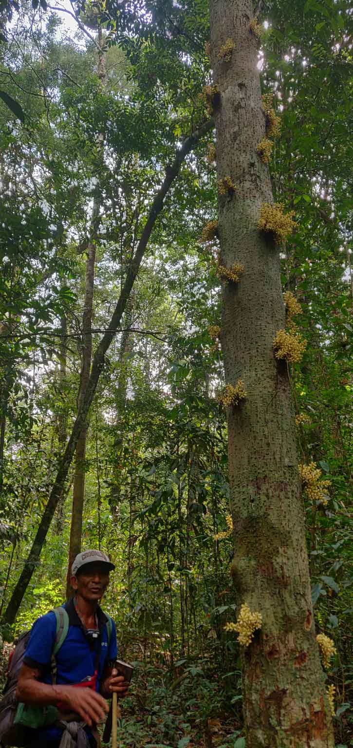 Après un lever un peu difficile pour Romain, on prend notre copieux petit-déjeuner (des nouilles !) et nous revoilà partis. On continue dans la jungle, puis à découvert ; mais grâce à la pluie d’hier et aux nuages encore présents, il fait bien moins chaud 🙂. On discute beaucoup avec Andy, on parle de politique, de voyages, de nos vies, c’est chouette. Dans la descente qui nous ramène doucement à la civilisation (cela fait plus de vingt-quatre heures qu’on n’a croisé personne), Sowann nous montre des fruits du coin : sortes de fraises des bois un peu fripées protégées dans des coques jaunes, et gros fruit jaune très juteux, absolument délicieux quand on arrive d’un trek ! Devant, Romain et Kim voient deux petits écureuils rayés dans un arbre.